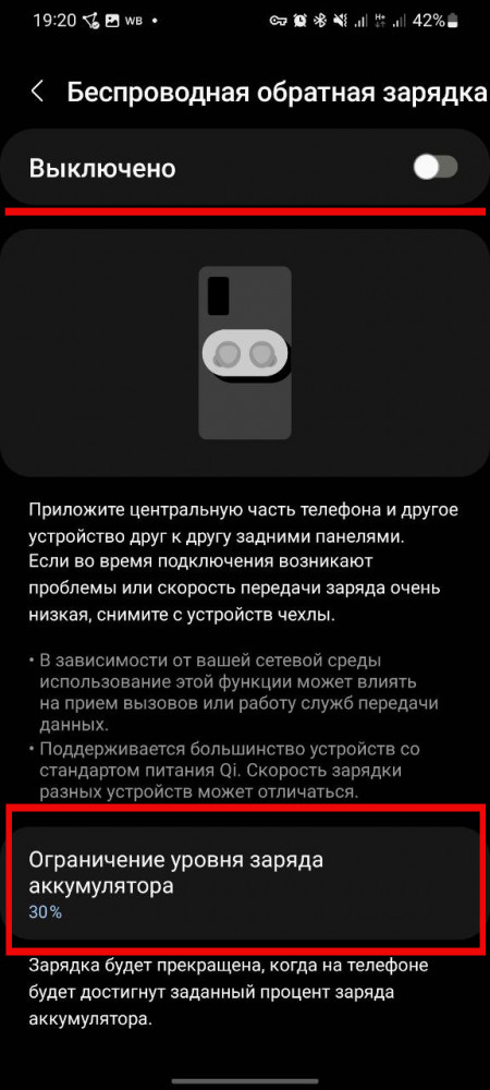 Чтобы активировать функцию, мало приложить один гаджет к другому. Включение реверсивной зарядки ищем в Настройках. Например, в устройствах Samsung она будет доступна в разделе Обслуживание устройства — Батарея — Беспроводная обратная зарядка. Активируем переключатель, а потом уже заряжаемся.