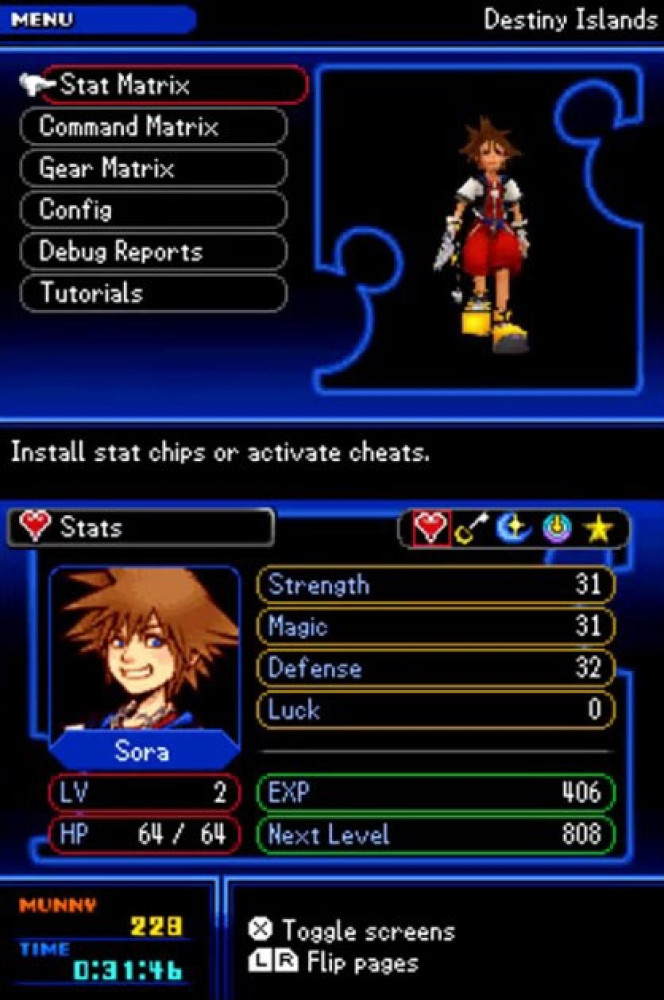 🔴 Геймплей по-прежнему в значительной степени не изменился по сравнению с предыдущими частями игры (за исключением прискорбной карточной динамики в "Chain of Memories"), хотя некоторые элементы оформления изменились. Естественно, вы по-прежнему сражаетесь бессердечными с помощью Keyblade'а, с такими атрибутами RPG, как уровни опыта, HP и магия. В соответствии с принципом "компьютерной программы", прокачка уровней управляется с помощью "чипов статистики", которые "установлены" в "Матрице статистики" Соры. Это что-то вроде сетки сфер из "Final Fantasy X" или сетки лицензий из "Final Fantasy XII". Объединение процессорных ядер с чипами, повышающими характеристики, улучшает характеристики Соры, такие как HP, сила или защита; это также открывает способности и "читы", которые можно использовать, чтобы изменить ход игры в вашу пользу.