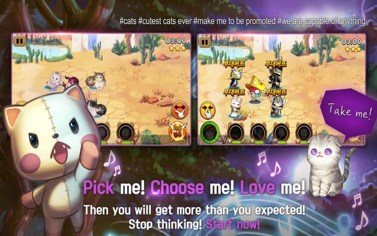 OCATSTRA – увлекательное RPG на андроид, где вы будете управлять забавными котиками. В этой игре вашей главной миссией будет собрать свою непобедимую команду котиков и с помощью их силы и способностей уничтожить всех противников. В этой игре вы будете исследовать темные подземелья или карабкаться на древнюю башню, проходя захватывающие уровни. Бросайте вызов сильным игрокам со всего мира и сражайтесь с ними на арене. После удачной битвы собирайте трофеи и призы, которые в дальнейшем вы сможете потратить на улучшение своих героев. В игре представлено более 100 милых и разнообразных кошек, а также она порадует игроков отличной графикой и спецэффектами.