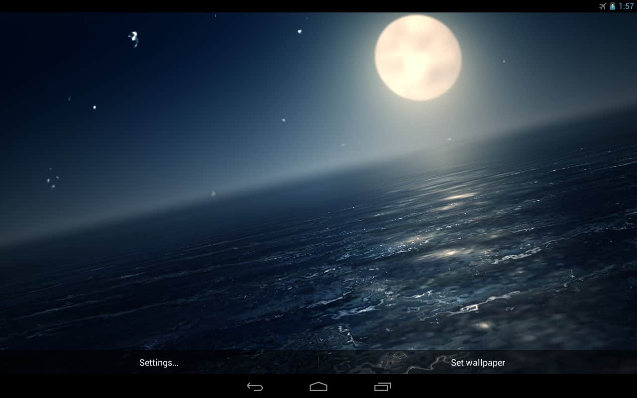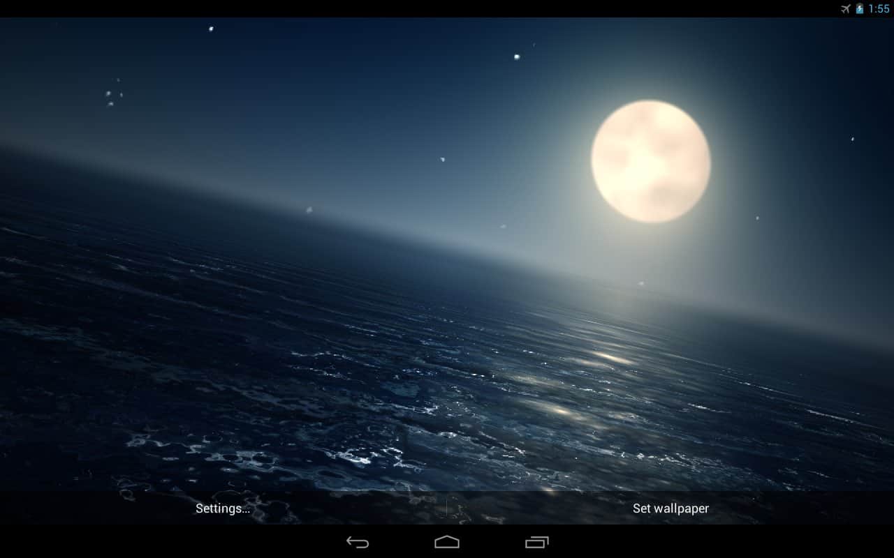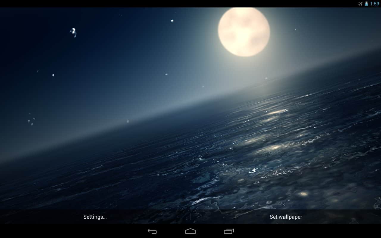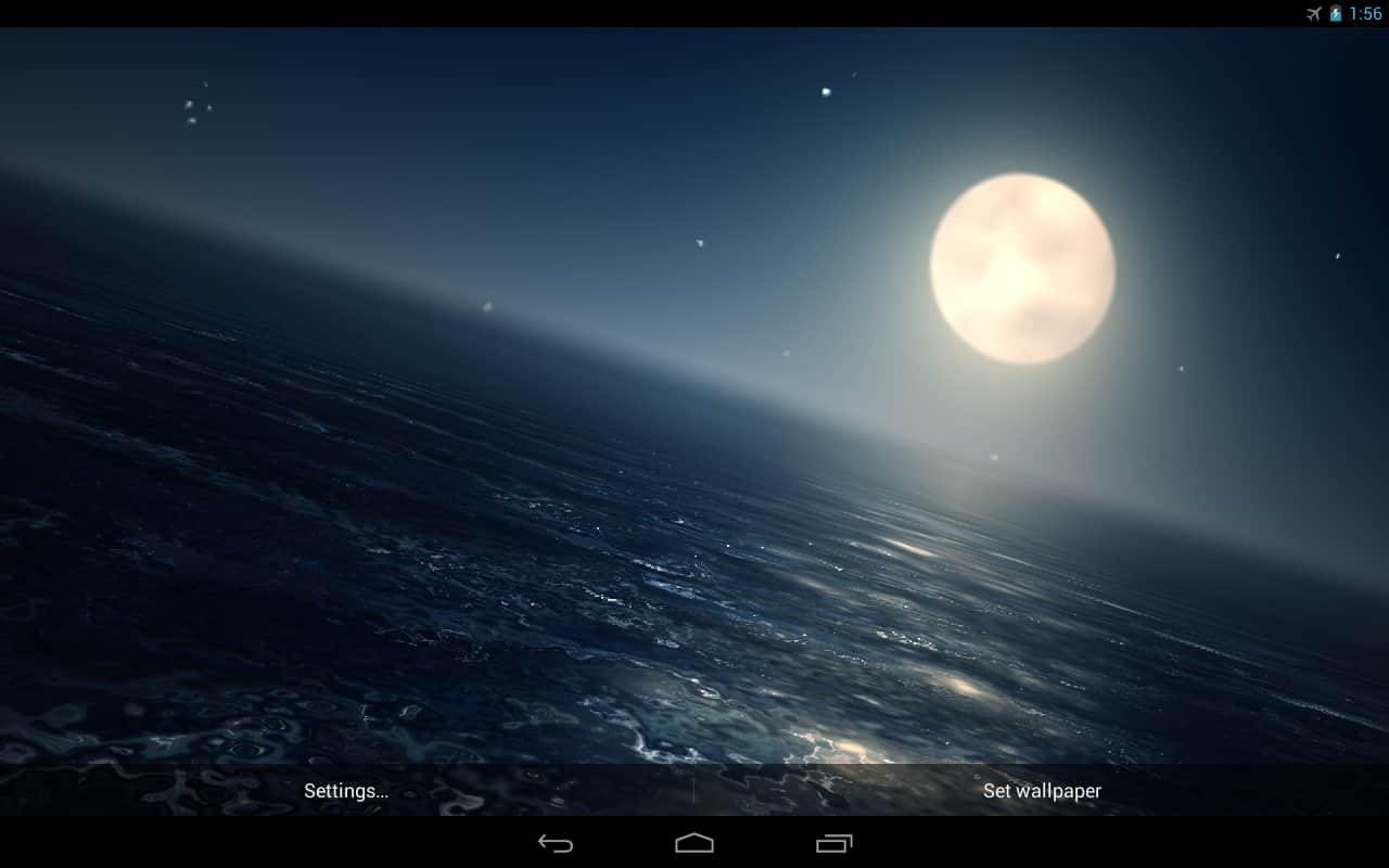 Ocean At Night Live Wallpaper – живые обои это один из способов создать свою индивидуальность в стандартной операционной системе Android. Каждый для себя сам решает какие живые обои устанавливать. Предлагаю вам ознакомится с обворожительными обоями в которых можно лицезреть ночной океан и белоснежный свет луны, освещающий воду. Живые обои реагирует на положение вашего девайса и при смены положения картинка так-же изменяется.