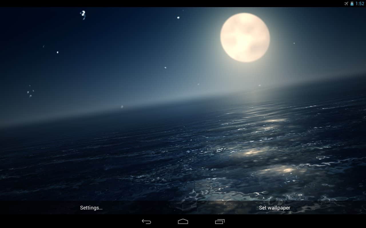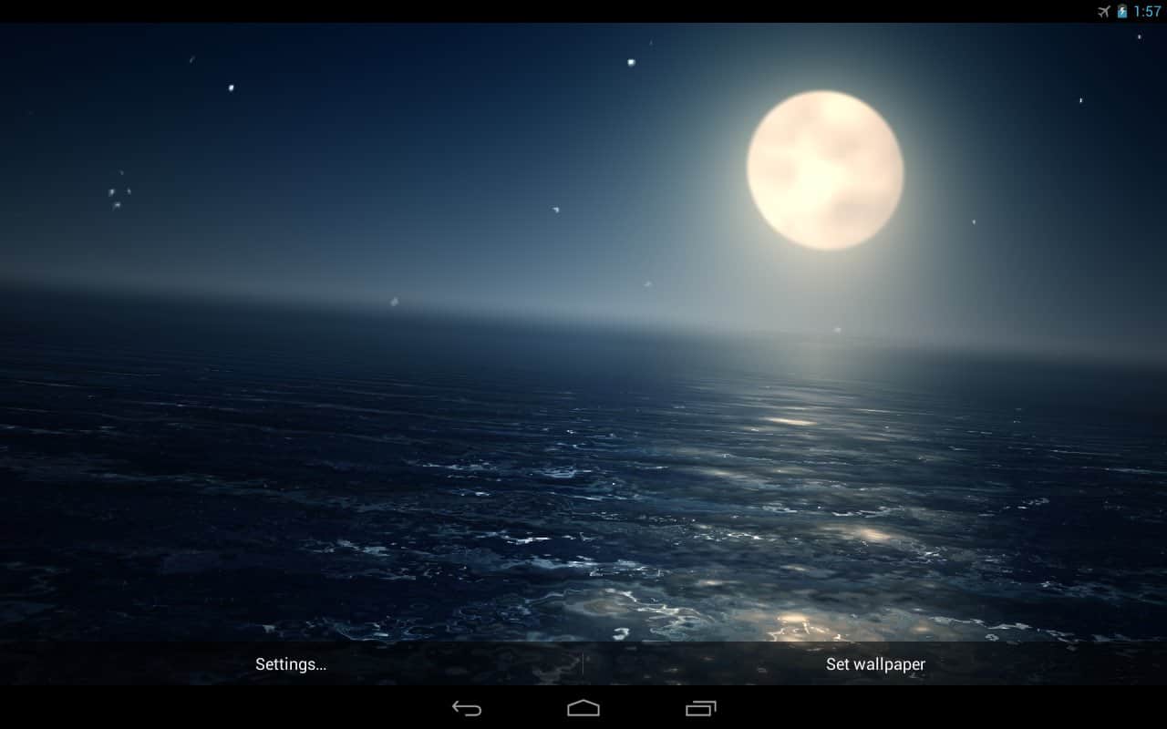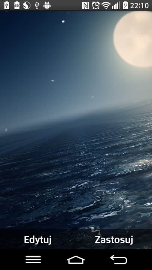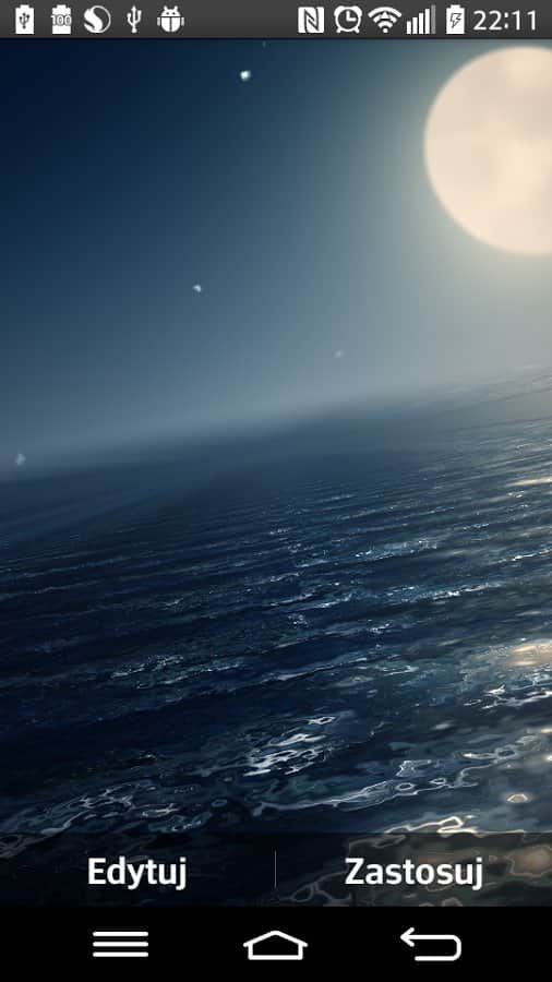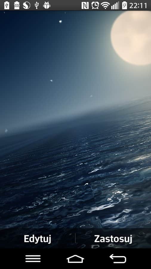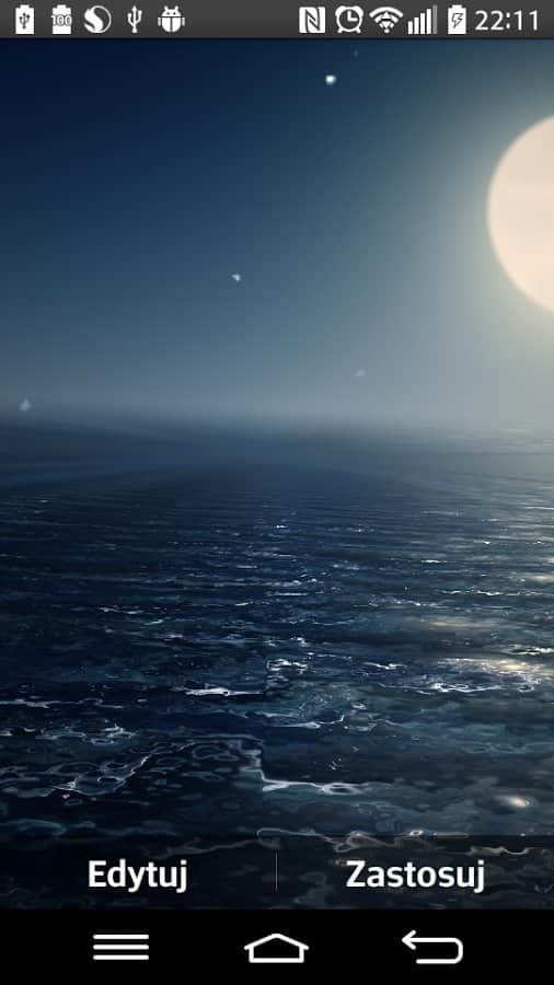 Ocean At Night Live Wallpaper – живые обои это один из способов создать свою индивидуальность в стандартной операционной системе Android. Каждый для себя сам решает какие живые обои устанавливать. Предлагаю вам ознакомится с обворожительными обоями в которых можно лицезреть ночной океан и белоснежный свет луны, освещающий воду. Живые обои реагирует на положение вашего девайса и при смены положения картинка так-же изменяется.