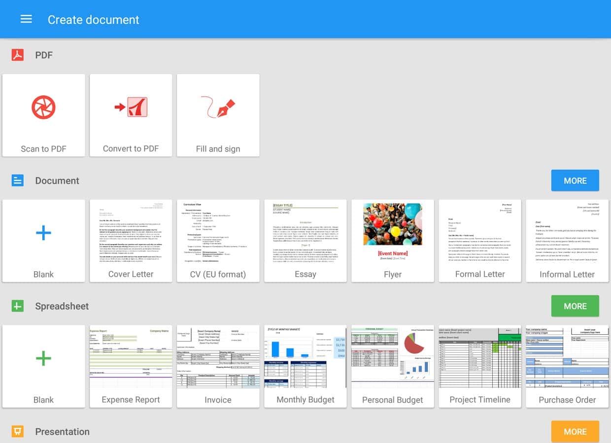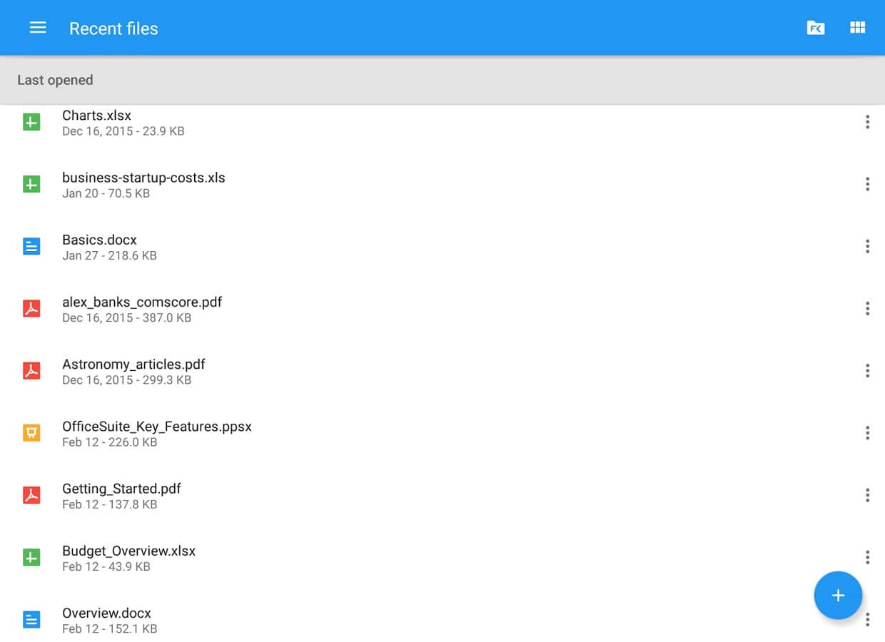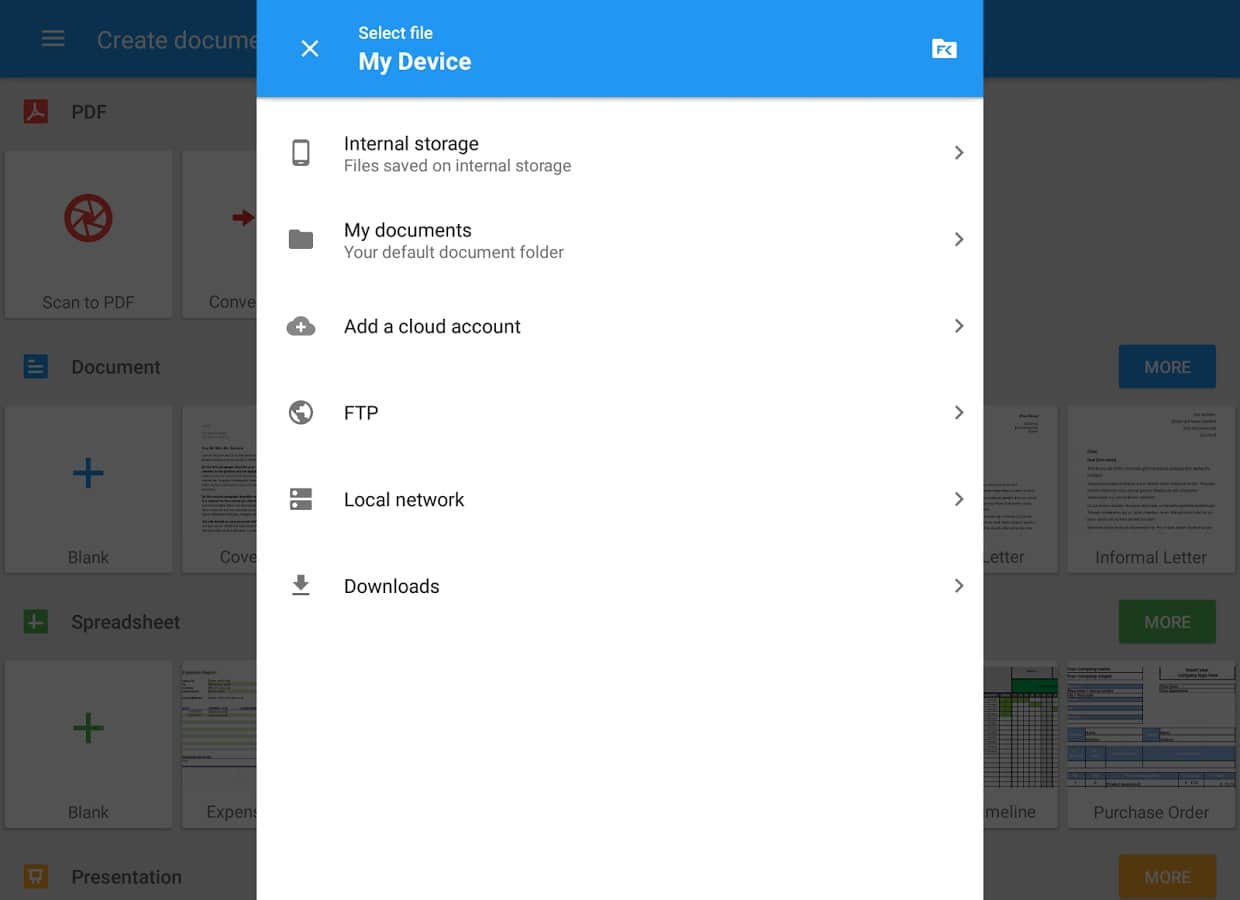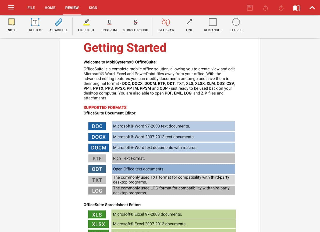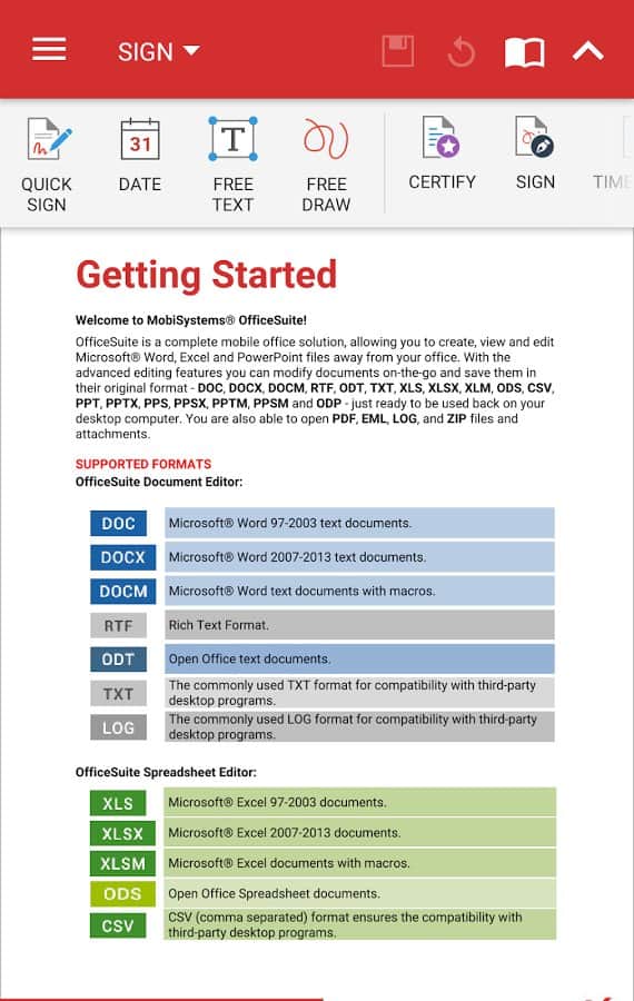 Поддерживаются файлы в формате DOC, DOCX, XLS, XLSX, PPT, PPTX, CSV, TXT, PDF. Также открываются документы в ZIP-архивах. Приложение имеет свой собственный файловый браузер для навигации и поиска документов.