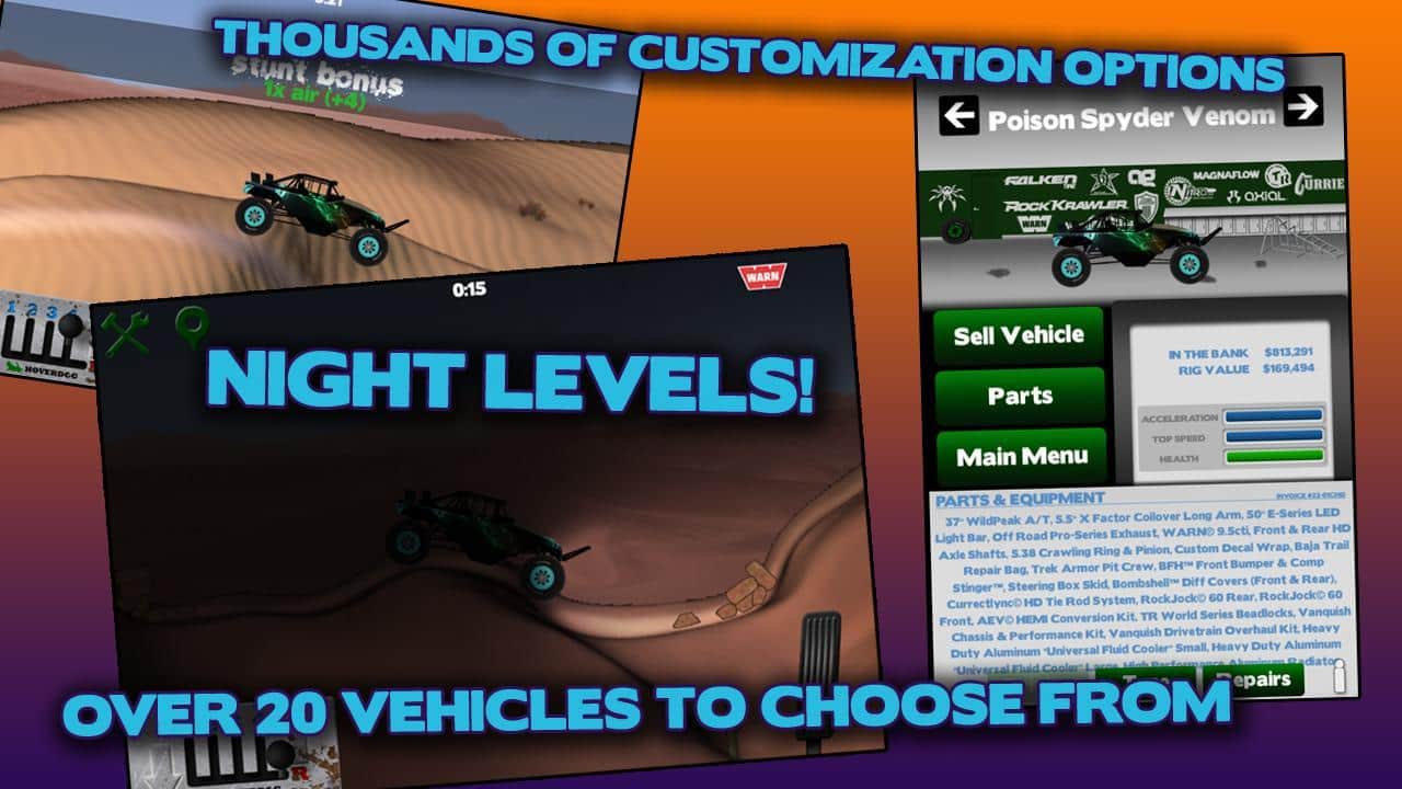 Offroad Nation Pro - это экстремальные гонки на внедорожниках по пустыне днем и ночью. Настоящие сложные трассы для настоящих гонщиков - любителям здесь не место, потому что сочетание физики и графики в игре просто обалденное! Тяжелые условия ждут вас каждую минуту пути - нет асфальта, только песок, масса адреналина и соперники, 36 уровней безумного труда за победу! Побеждай и сделай свой внедорожник вездеходом, которому все подвластно!