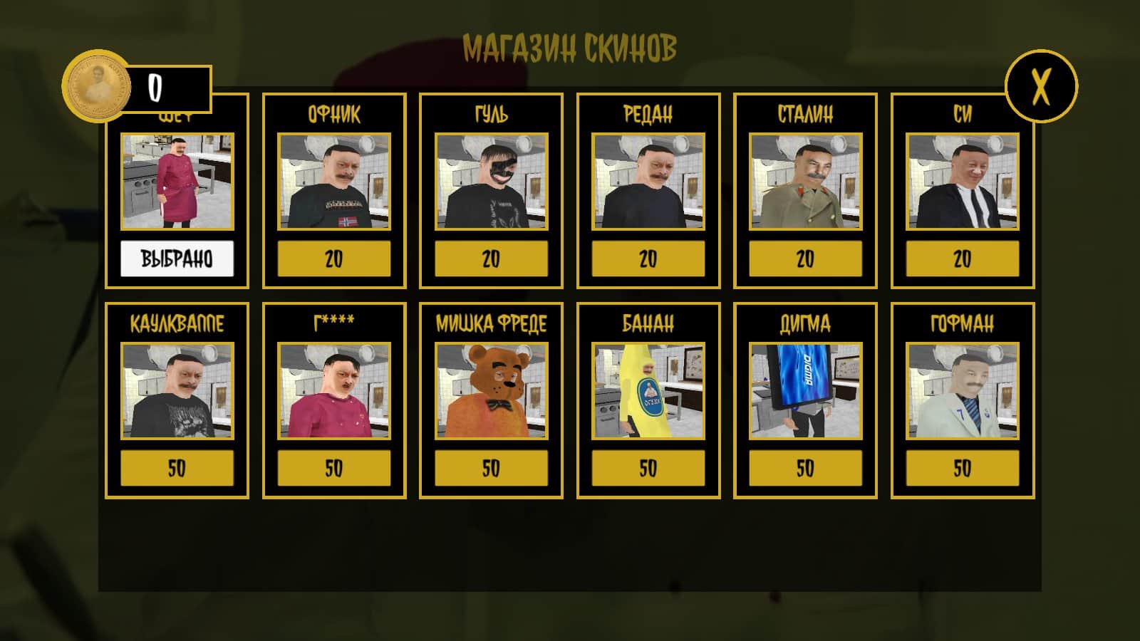 OGUZOK HORROR - игра в которой вам предстоит отклеить этикетки с десяти бананов, незаметно для Шефа, который заставил вас это делать. Вы находитесь в точной копии ресторана Клода Моне, где каждый уголок хранит свои секреты. Вам предстоит открывать двери с помощью ключей, разгадывать пароли от сейфов, избегать внимания Шефа и придумывать способы защищаться от него. Будьте настороже и придумывайте хитрые планы, чтобы успешно выполнить данное задание и не попасть в лапы Шефа. В каждом шаге скрывается возможность сложных испытаний, но и уникальных открытий. Будьте готовы к приключению, которое вас ожидает в ресторане Клода Моне.