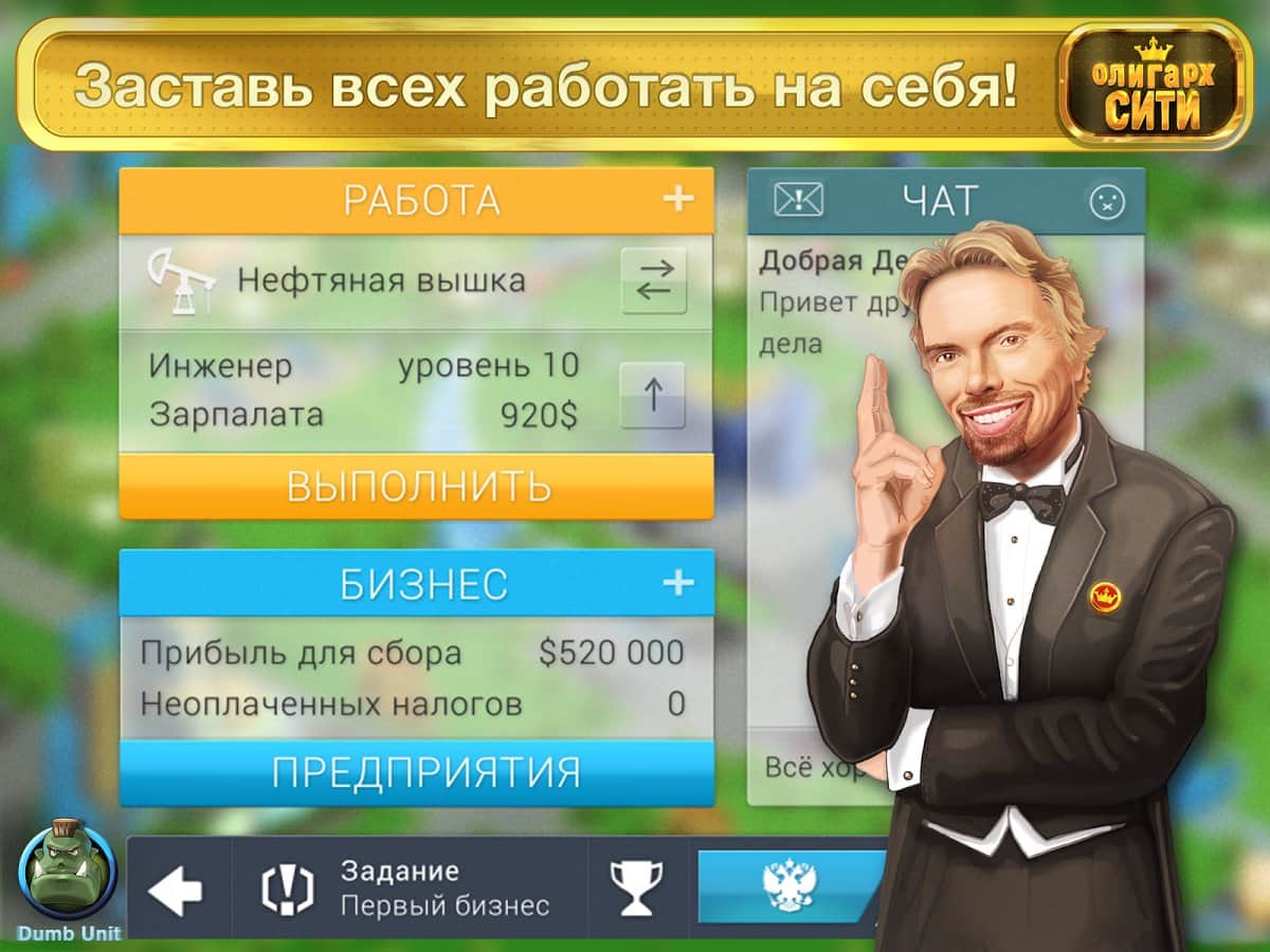 Олигарх-Сити: Против санкций! - игра позволит вам влиться в среду успешных акул бизнеса. Докажите всем, что вы ни чем не хуже других успешных бизнесменов. В вашем кармане есть незначительна я сумма денег, на которую можно устроить хорошую вереринку, но мы пойдём другим путём. Все деньги вложим в свой первый бизнес и попробуем заработать свои первые деньги. Получая деньги вкладываем их в новые предприятия и разрастаемся до размеров огромного холдинга владеющего различными видами бизнеса. Соревнуйтесь с друзьями и сделайте всё возможное, чтобы доказать что вы лучший бизнесмен.