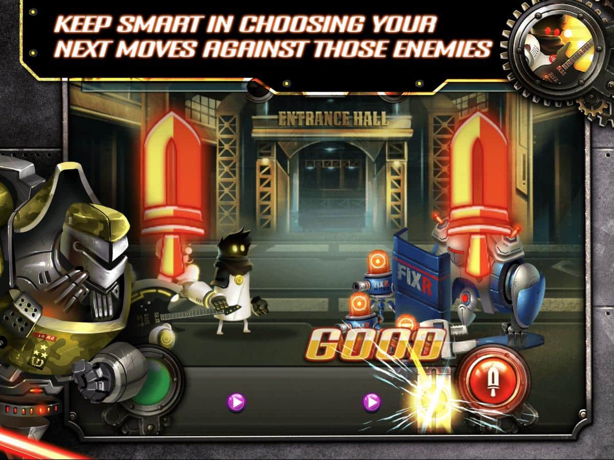 Omega : The first movement - захватывающая игра от разработчиков Goya Games которая расскажет вам историю одного киборга, который ищет правду в ужасном мире. Эта игра вобрала в себя два жанра боевой экшен с элементами музыкальной игры. Наш герой оказался на улице совсем в юном возрасте, повзрослев он захотел стать киборгом, взяв в руки гитару в виде топора он начал прорубать себе дорогу и сражаться с мощными врагами. Помогите ему в этом сложном деле. Проходя один квест за другим вы начинаете понимать что не все так просто в этой игре как казалось с первого раза.