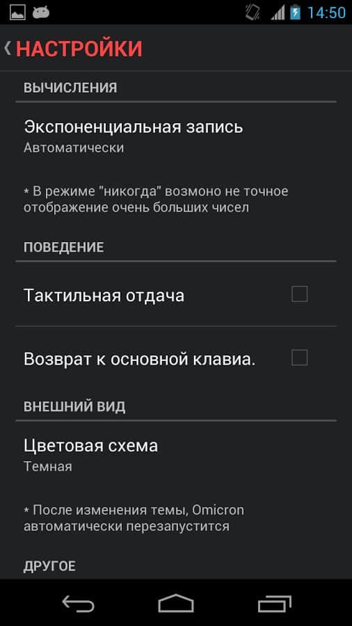 Omicron Калькулятор – отличный калькулятор в Holo стиле, который заменит стандартный калькулятор вашего андроид устройства на все 100%. Данный калькулятор запросто справиться не только с простыми, но и со сложными выражениями, так же есть функция моментального вычисления результата. В настройках приложения вы можете изменить тему оформления, включить или выключить тактильную отдачу при наборе.