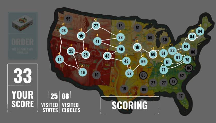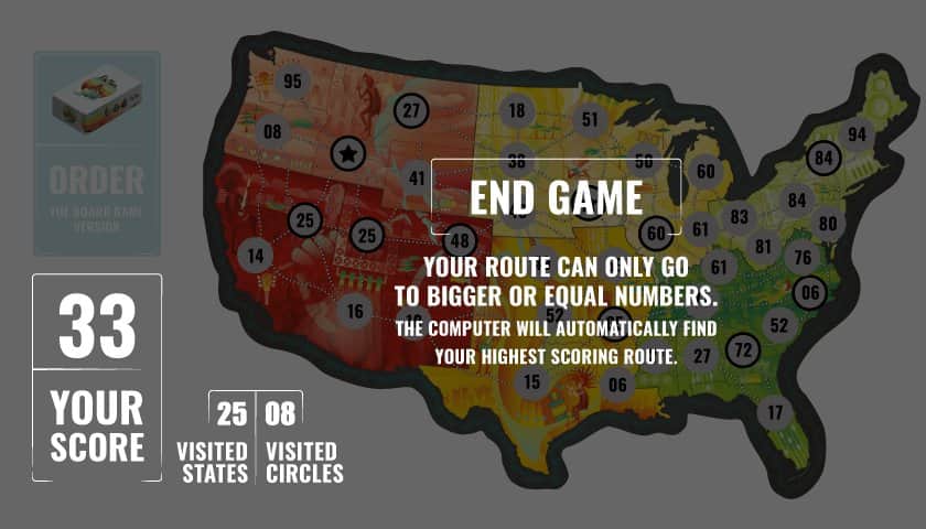 On Tour Board Game – популярная настольная игра теперь и на андроид устройства. В этой игре вы в компании других игроков отправитесь в увлекательный тур где вашей задачей будет планировать остановки на протяжении сто дневного путешествия по различным штатам. Посетите как можно больше штатов за свое путешествие и наберите достаточное количество очков. Каждый ход в туре будут бросаться кости чтобы получить двухзначное число – это и будет ваша следующая остановка. Выпавшие числа все игроки отмечают в своих картах, регионы в которые они попадают ограничены тремя картами, расположенными посреди стола. В конце игры каждый игрок рисует маршрут своего следования соединяя числа между собой от меньшего к большему. Получайте очки за каждый штат и выйдите победителем.