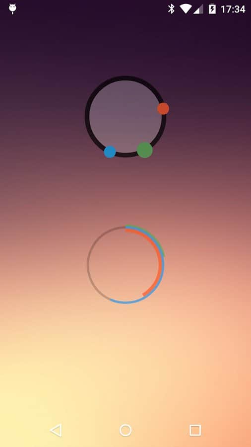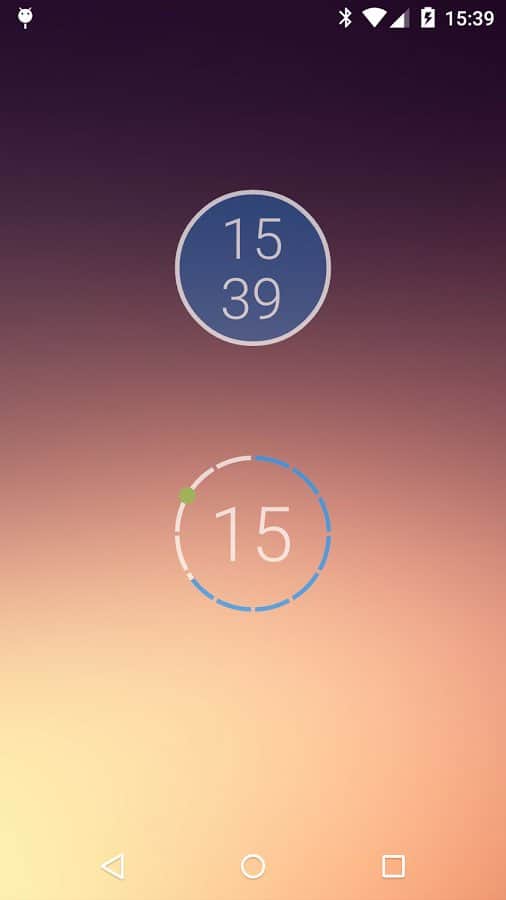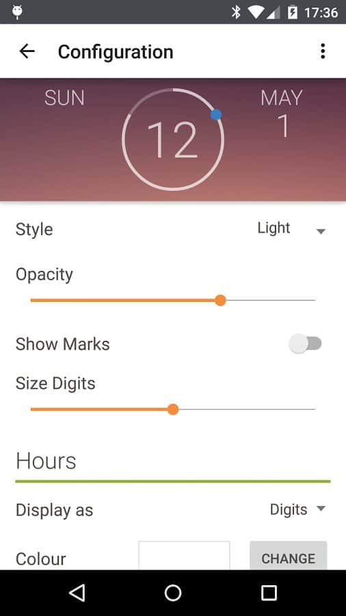 Представленный виджет просто создан для любителей необычных часиков. В данном случае, пользователь будет любоваться минималистичным кольцом, которое сочетает в себе особенности цифровых (собственно, цифровое обозначение времени) и аналоговых (движение по циферблату) часов. В приложении можно отрегулировать прозрачность, подобрать подходящий шрифт, выбрать цвета отдельных элементов, режим отображения времени, желаемые эффекты и включить режим отображения даты. Кроме того, по тапу на виджет может вызываться нужная команда, а в нижней области — меню настроек.
