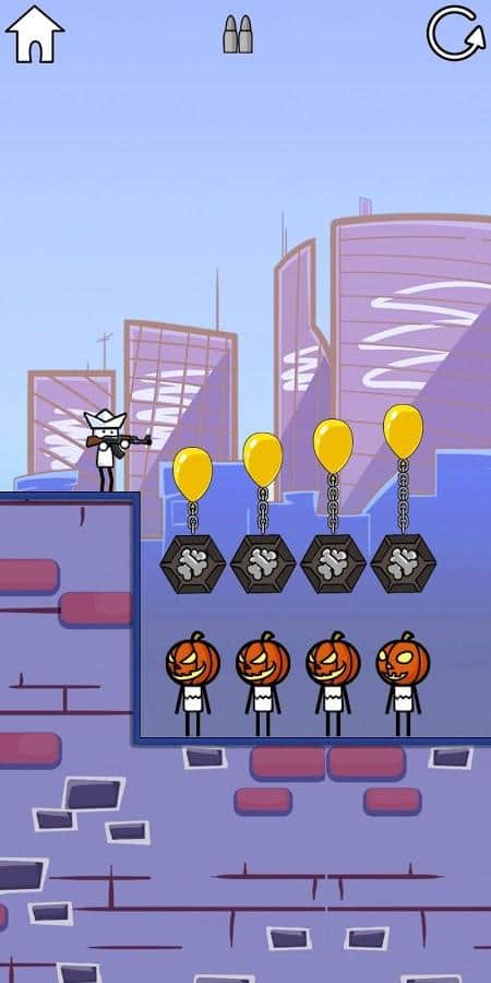 One Bullet – красочная головоломка на андроид, где вы будете собирать урожай к празднику Всех Святых - Хэллуину. Возьмите под свой контроль стрелка и выходите на охоту выслеживая и уничтожая тыквы. Прицеливайтесь и стреляйте в тыквы учитывая при этом траекторию и дальность полета пули. Старайтесь уничтожать все тыквы с помощью одного выстрела и получайте награды. Учитывайте также что пули могут рикошетить, отскакивая от стен и других объектов. Пройдите более 100 уровней, нарисованных вручную и наслаждайтесь отличной графикой и реалистичными звуковыми эффектами. Соберите свой урожай из комичных тыкв и подготовьтесь к празднику.