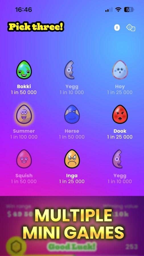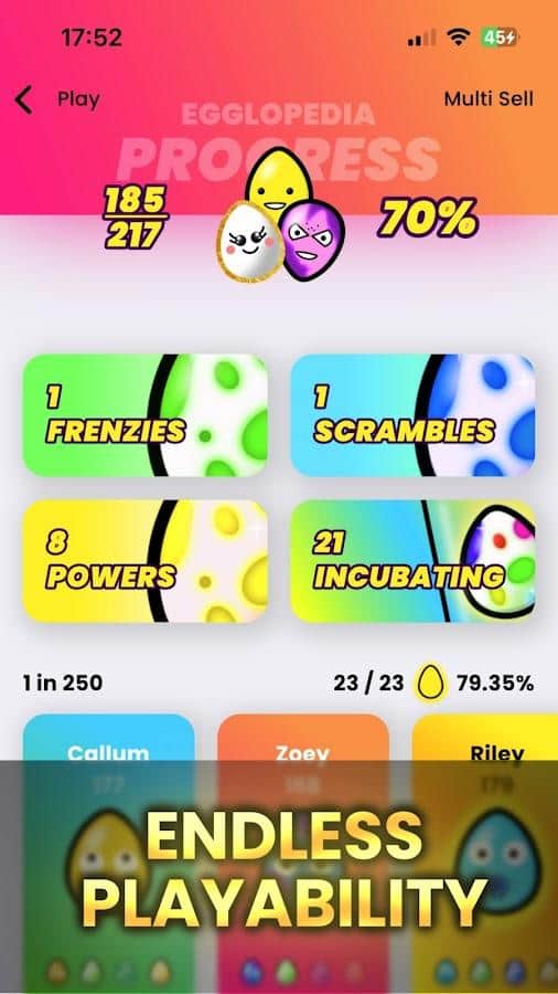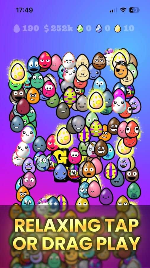 One in a Trillion - Вступайте в наше захватывающее сообщество и окунитесь в увлекательную охоту за самыми эксклюзивными яйцами на планете. Игровой процесс до безобразия прост достаточно тапнуть или провести пальцем по экрану. Никакого давления, только добровольное участие в соревнованиях с игроками со всего мира за ценные награды и признание. Постоянно раскрывающийся геймплей, где вы открываете новые яйца, собираете их и открываете новые уровни. Создавайте уникальные глифкарты для каждого найденного яйца. В нашем арсенале уже более 215 очаровательных яиц для коллекции, и этот список постоянно пополняется. В мини-играх вы сможете найти каждое яйцо четырьмя разными способами, чтобы полностью завершить коллекцию.