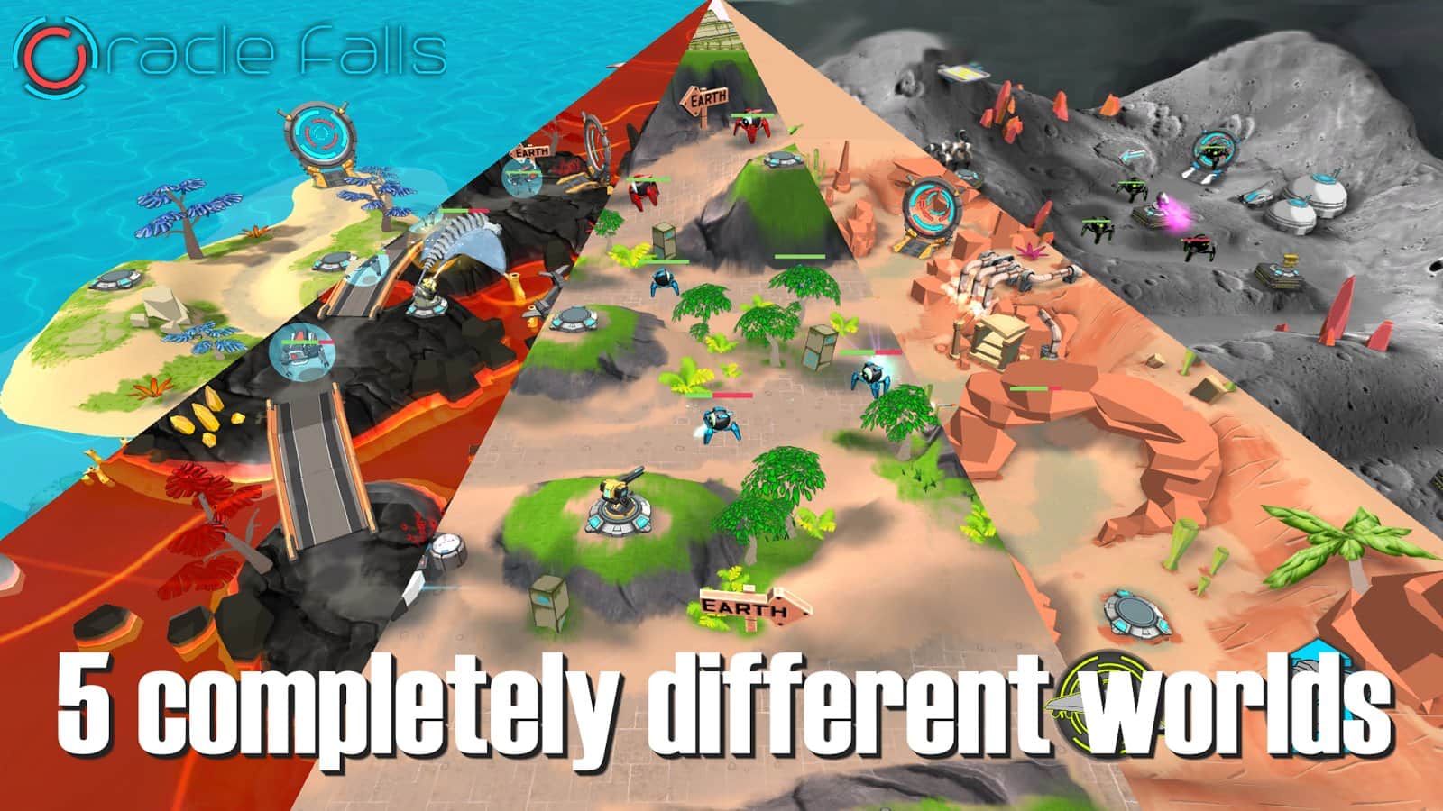 Oracle Falls - на землю напала неизвестная расса инопланетян, и ипользуют они самых новейший разработки роботов, ваша задача не отставать от них и защитить свою базу при помощи автоматических турелей. Конечно же по ходу игры вы будете открывать и усиливать свои башни, однако здесь очень важную роль играет и ваш строительный корабль. С его помощью вы можете временно усиливать свои башни используя кристалы, что бы пополнить кристалы отправляйте свой корабль на место их добычи.