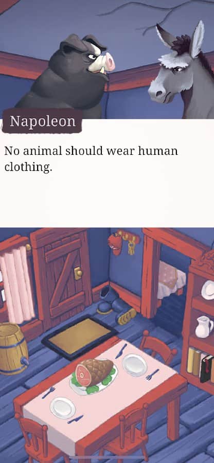 На скотном дворе Оруэлла животные отбились от своих хозяев-людей. Теперь они главные. Распределяйте их задачи, управляйте своими ресурсами, выбирайте законы и руководите их пропагандой. Определите, какие из животных будут приносить жертвы, а какие будут «равнее других». В зависимости от того, как вы играете, вы можете столкнуться с ситуациями, очень близкими к тем, что описаны в книге, или с ситуациями, на которые повлияли события, в которых Оруэлл никогда не жил. увидеть.