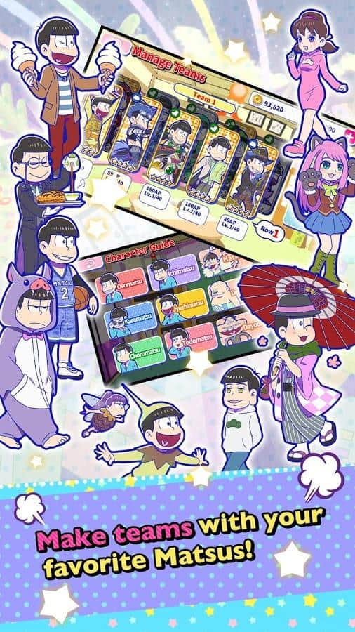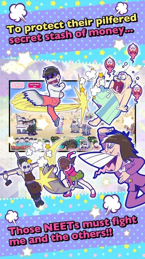 Osomatsu-san Hesokuri Wars~Battle of the NEETs – экшен на андроид, со стремительными сражениями. В этой игре в стиле аниме вы возьмете под свой контроль многочисленных героев и будете с помощью них атаковать город врага. Вашей главной задачей будет как можно быстрее победить всех врагов и разрушить город соперника при этом заработать немало денег. Примите участие в динамичных сражениях и применяйте уникальные приемы и атаки, не давая сопернику не единого шанса на победу. Прокладывайте свой путь вперед и приобретайте для героев разнообразные костюмы и оружие. Исследуйте разнообразные локации игры и сражайтесь в новых битвах.