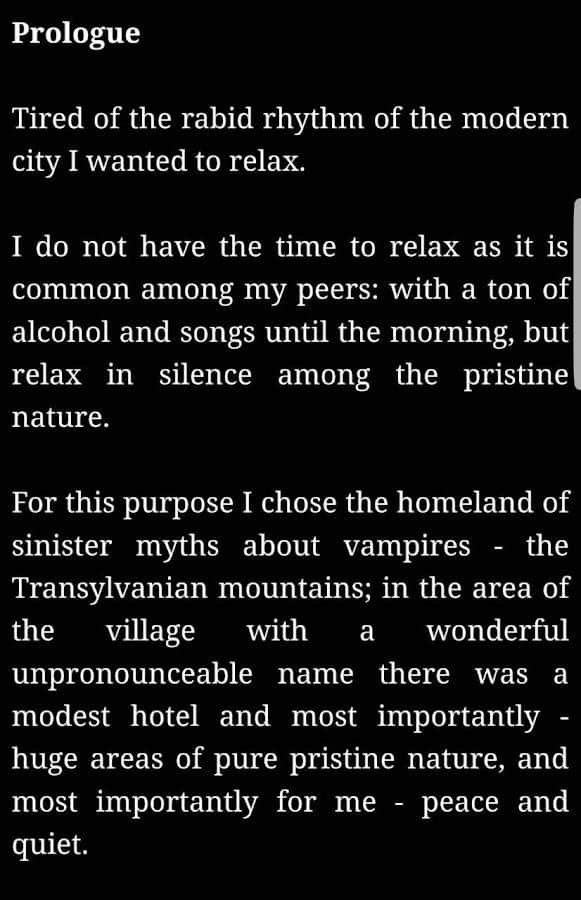 Сюжет. Гг уезжает на Трансильванские горы отдохнуть. Но отель в который он хотел заселиться был забит под завязку и ему предложили президентский люкс в другом отеле. Заселившись, ночью гг мешает уснуть белый шум телевизора соседей. Гг решает разобраться и идёт к соседям. Дверь у соседей приоткрыта, а в самом номере лютый ср_ч и пятна чего-то красного на кровати. Дальше расписывать не буду, если заинтересовало, то можете и сыграть. Сразу скажу в игре нет вампиров, что меня удивило.