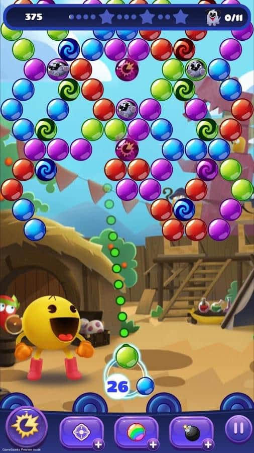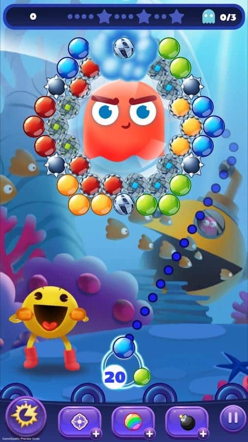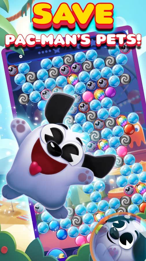 PAC-MAN Pop - Bubble Shooter – занимательная игра на андроид, где вы будете помогать герою PAC-MAN вернуть все фрукты в PAC-Лэнд. Заносчивые призраки Инки, Блинки, Пинки и Клайд заменили все фрукты и домашних животных из сказочного мира в ловушку и теперь только наш герой PAC-MAN может спасти их и вернуть обратно. Стреляйте разноцветными пузырями в скопление их наверху и очищайте игровое поле от пузырей, при этом собирая падающих домашних животных. Помогите отважному герою пэкмену собрать всех домашних животных и освободить их из плена приведений. Эта веселая игра будет радовать вас на протяжении большого количества уровней своими головоломками и задачками.