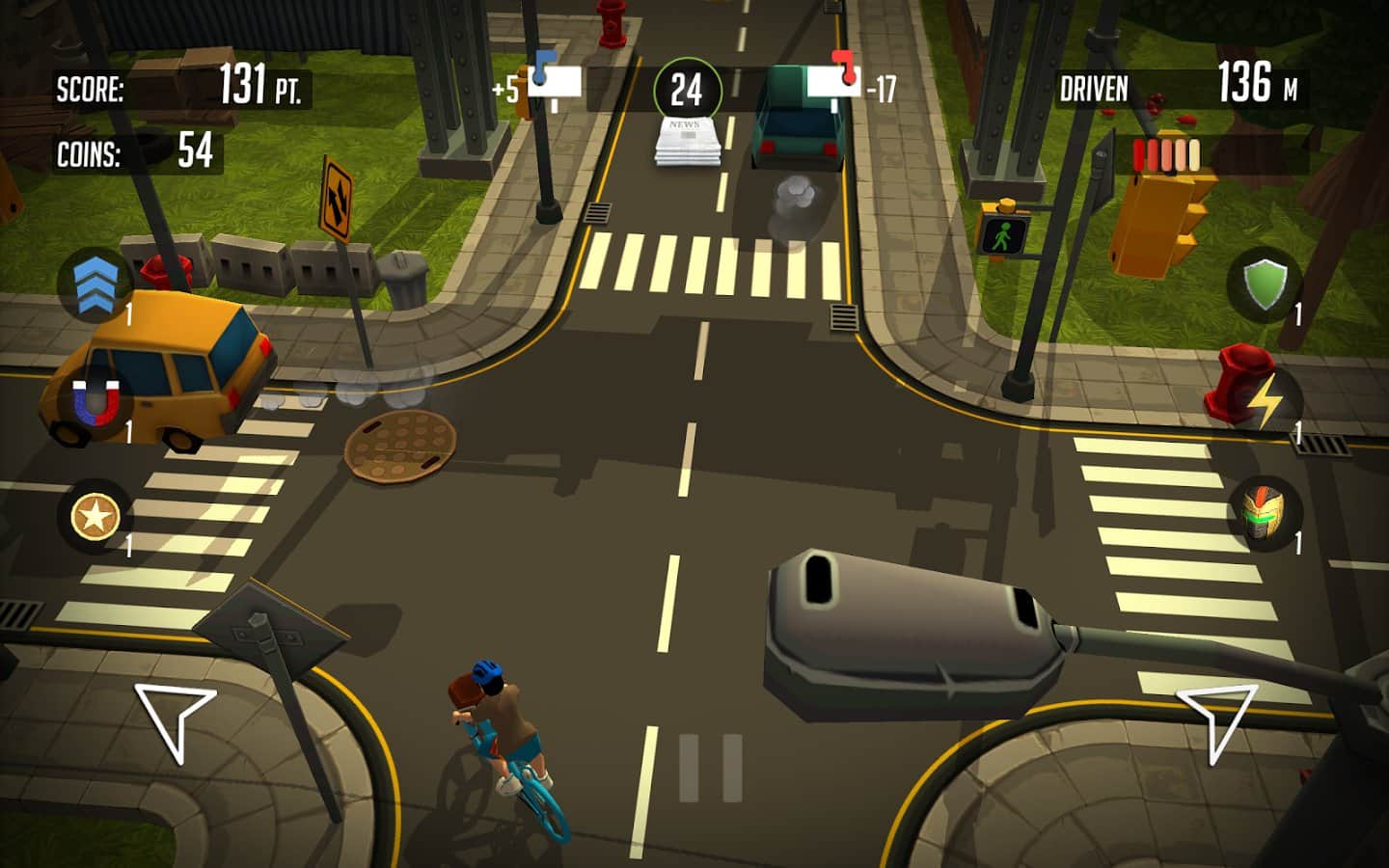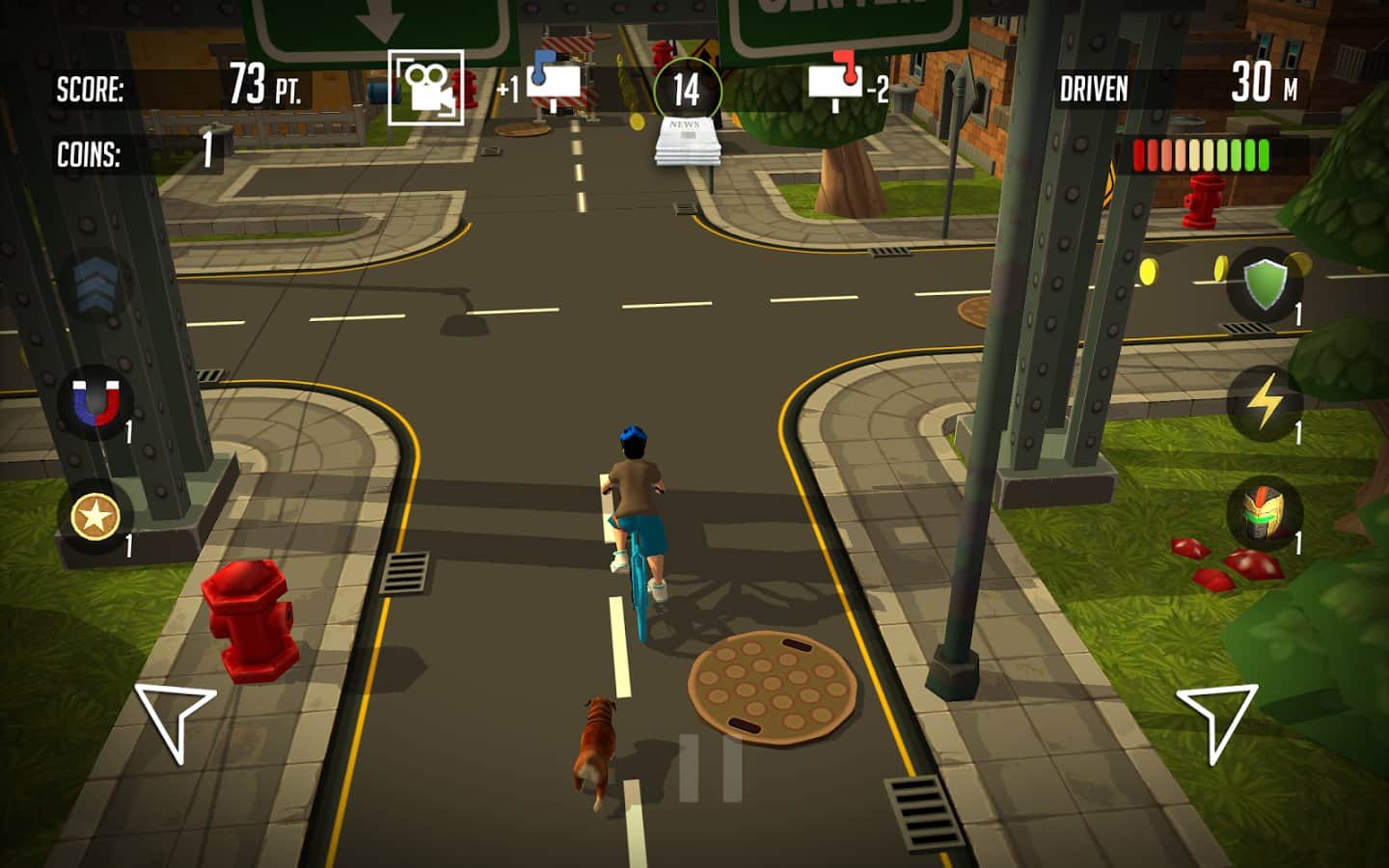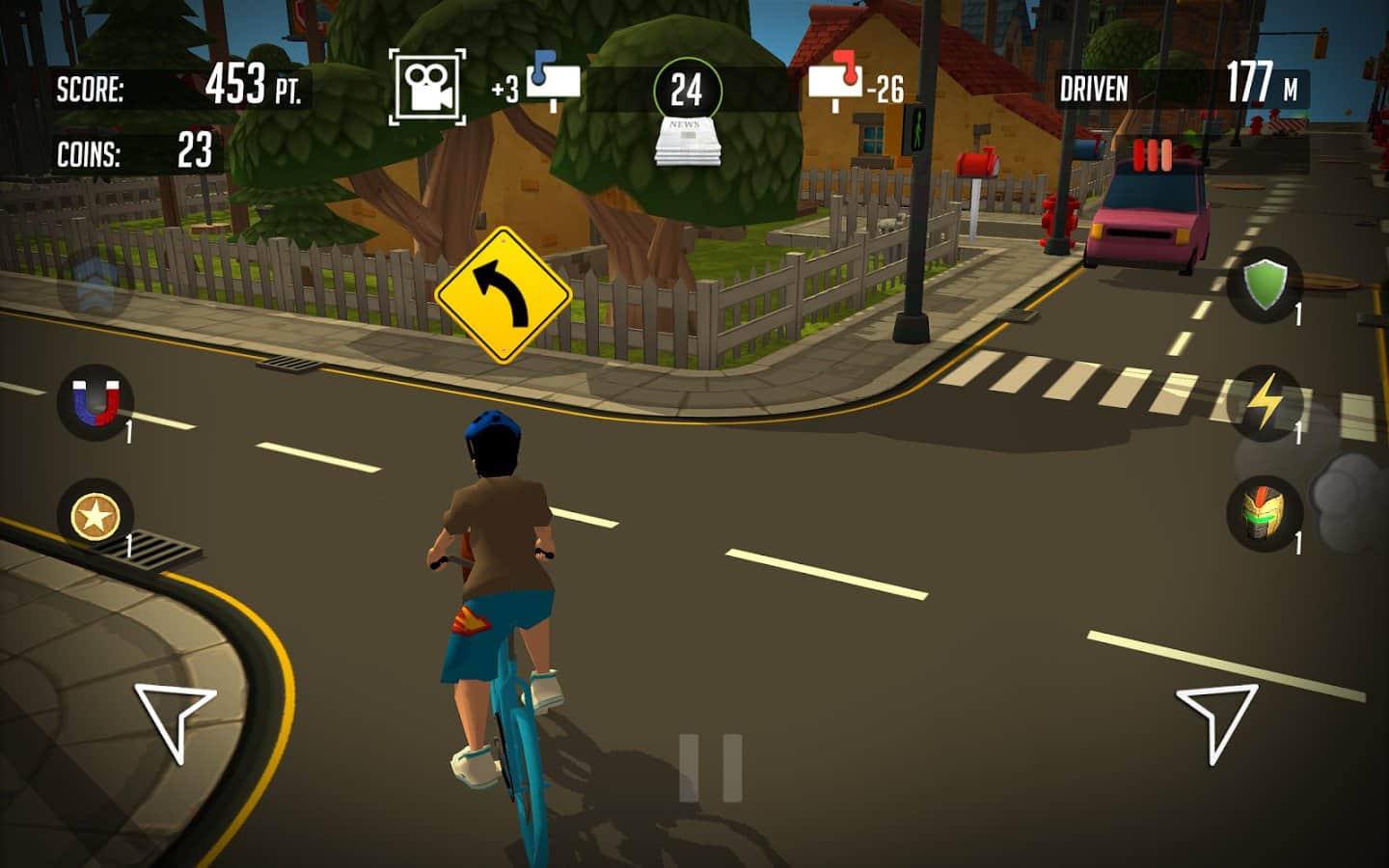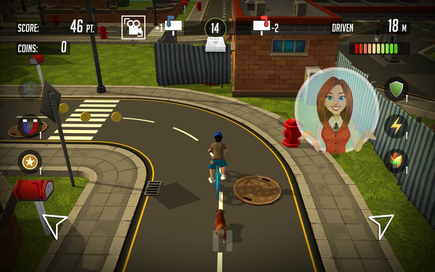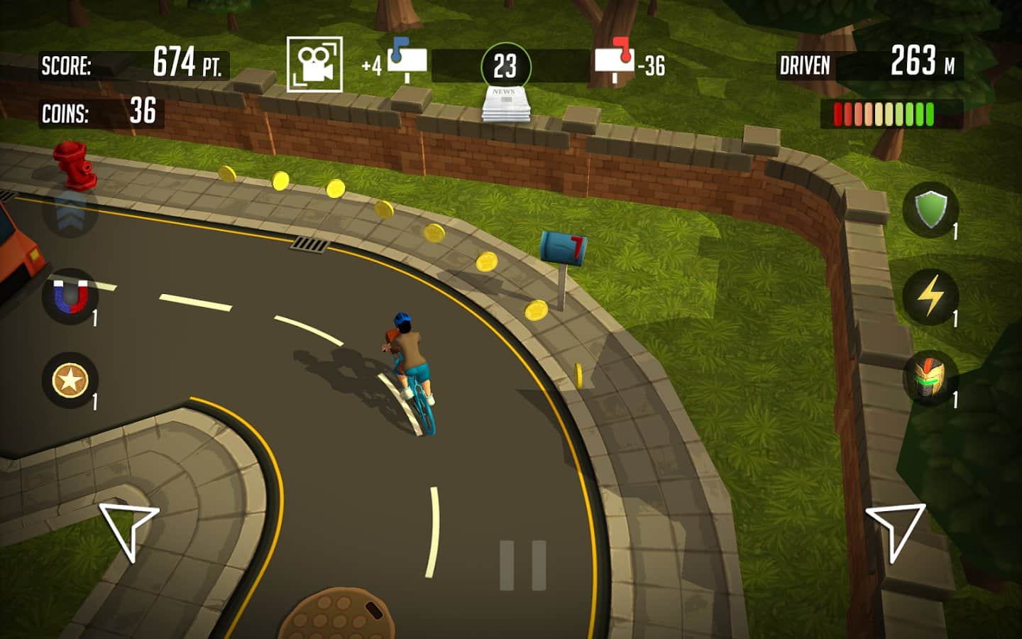 Paper boy: Infinite rider – станьте разносчиком газет в этой игре и доставляйте корреспонденцию в почтовые ящики горожан. В этой игре вы будете управлять героем, ездящим на велосипеде и закидывающим газету в почтовые ящики. Следите за указателями, показывающим вам маршрут, по которому вашему велосипедисту необходимо двигаться и кидайте газеты только в синие ящики. За каждую правильно доставленную газету вы будете получать деньги, а также собирайте монетки по пути следования и бонусы в виде усилений, брони и магнитов. На собранные деньги улучшайте велосипед героя или покупайте новый. Игра порадует вас отличной яркой графикой и многочисленными бонусами.