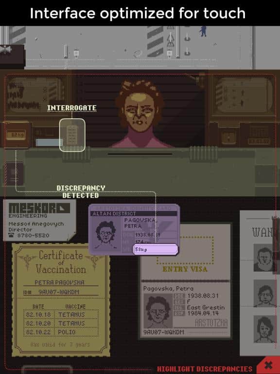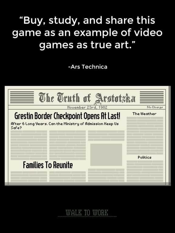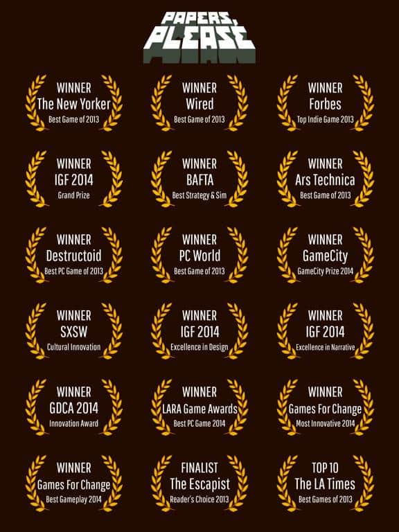 Papers, Please - Антиутопический документальный триллер. История игры начинается, с того, что вы вступаtnt на новую должность - инспектор иммиграционной службы. После окончания шестилетней войны между двумя государствами пограничный город Грештин был поделен на две части. Ваша задача - контролировать поток лиц, проходящих через границу в городе, проверяя документы въезжающих с помощью простой системы проверки, досмотра и снятии отпечатков пальцев.