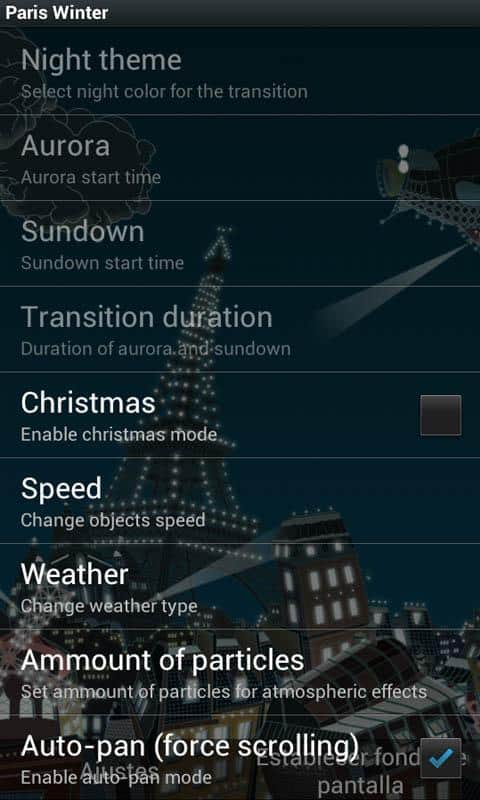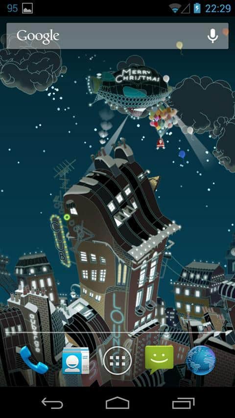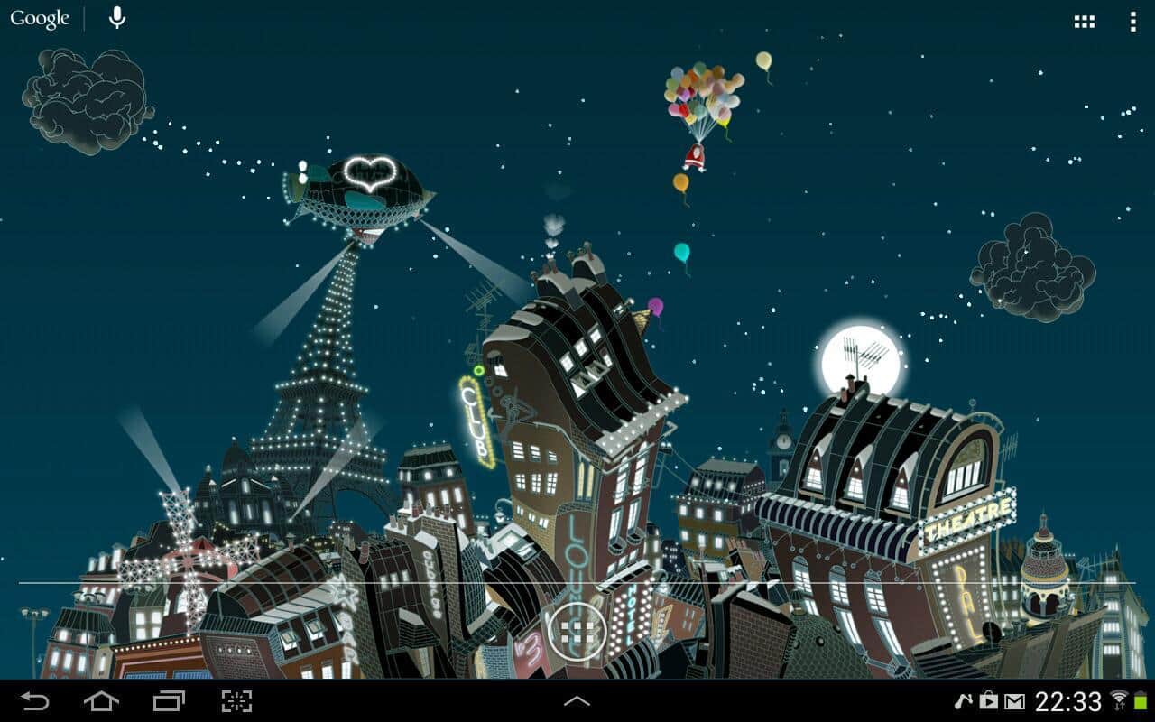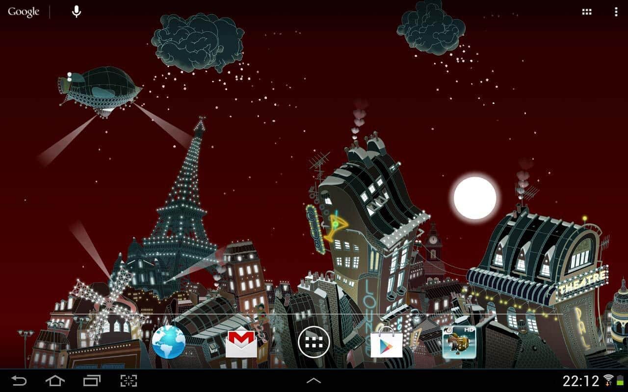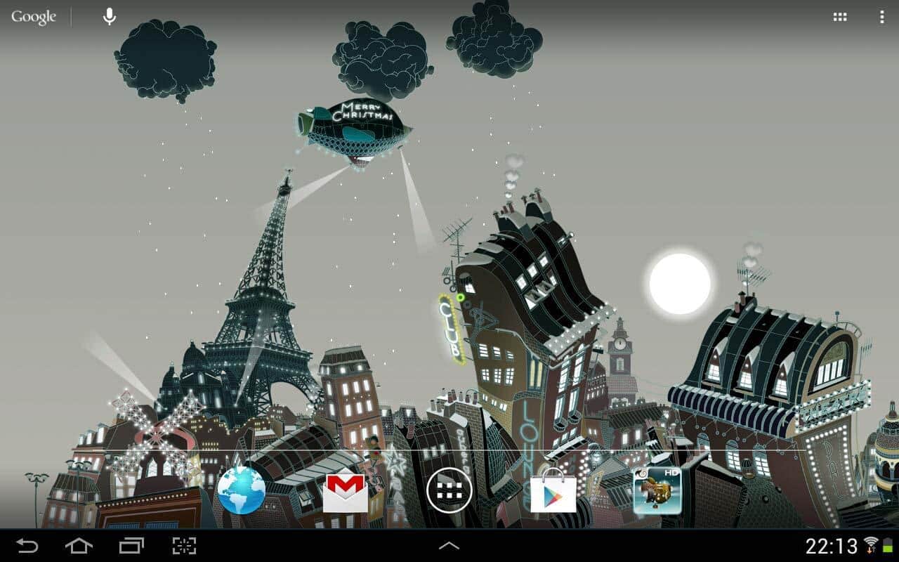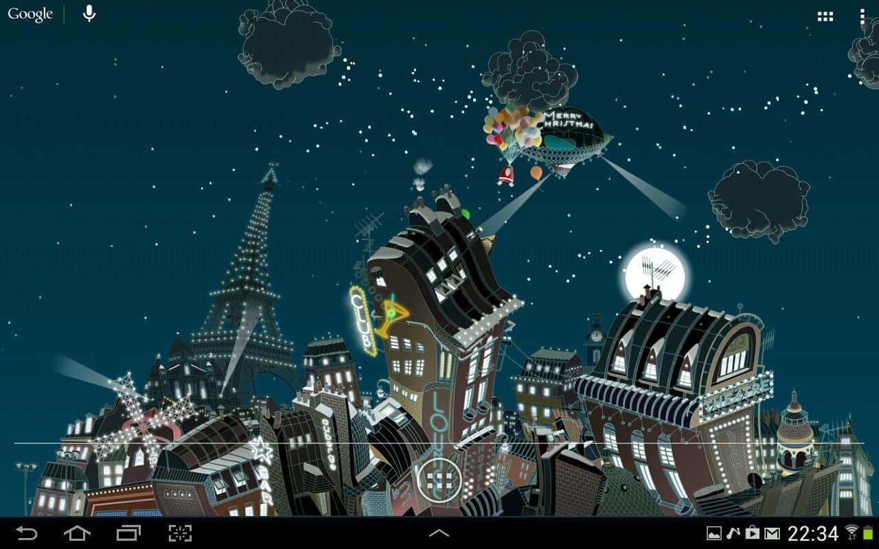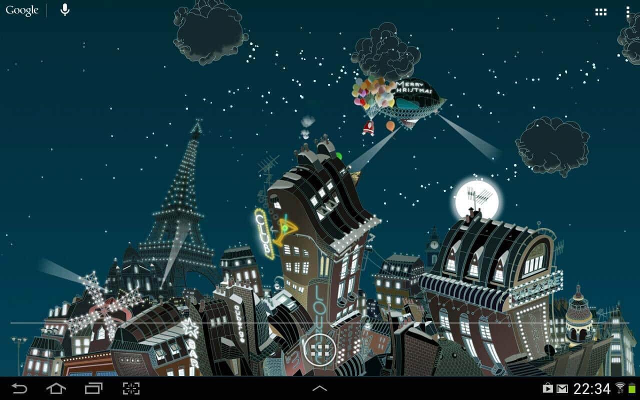 Paris winter - проведите зиму в миниатюрном Париже на вашем андроид планшете. Праздничные огни, дирижабль над городом, воздушные шары, снежные тучи над городом любви и счастья, что еще нужно для отличного настроения в зимнюю пору года. Большое количество настроек.
