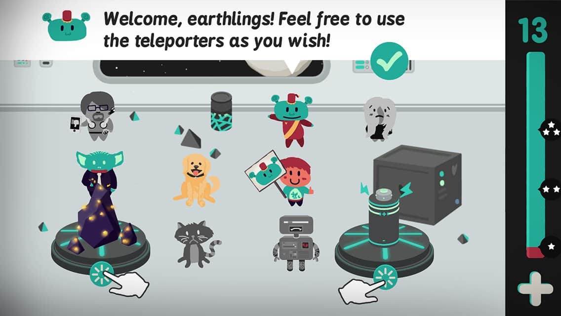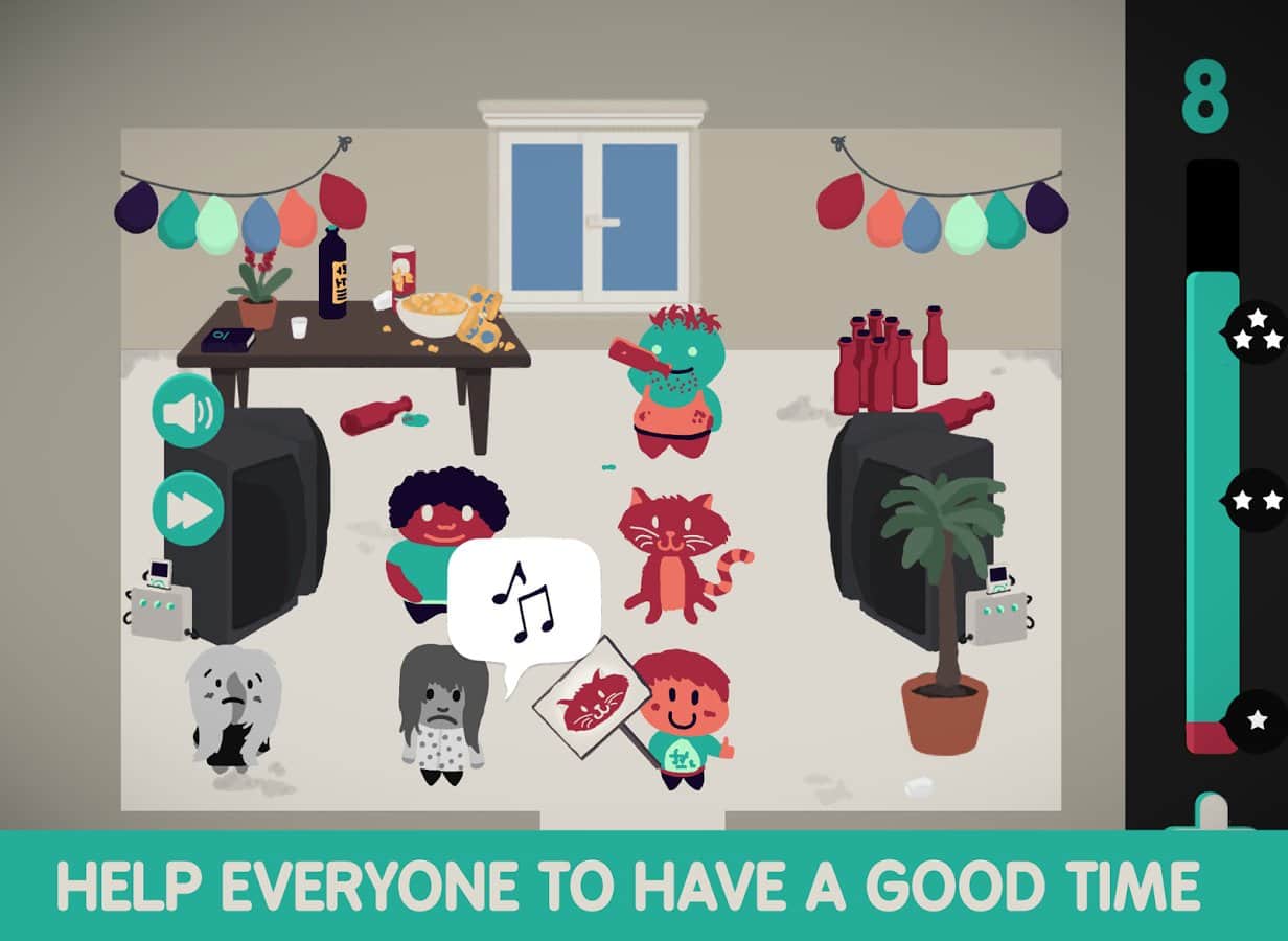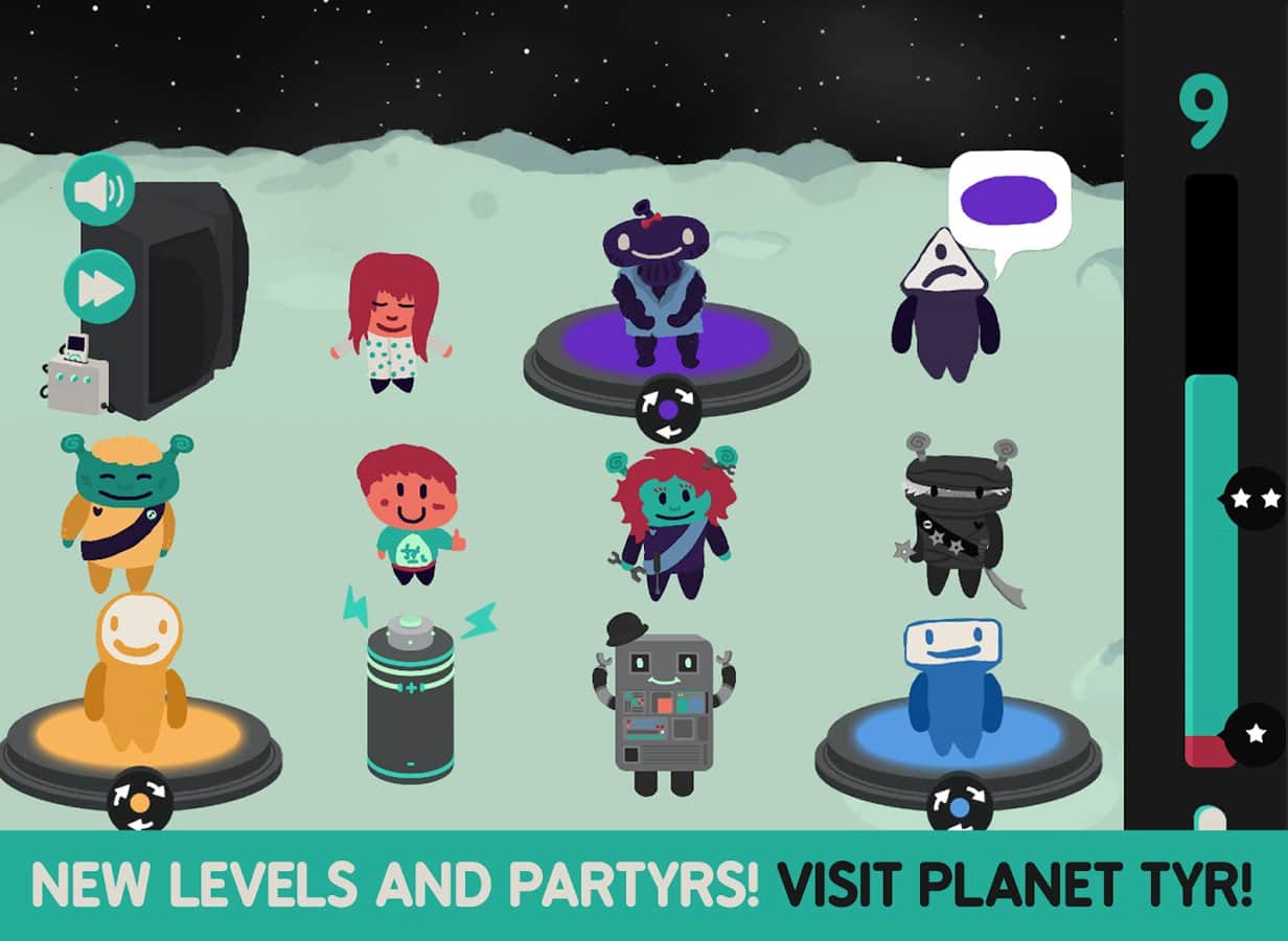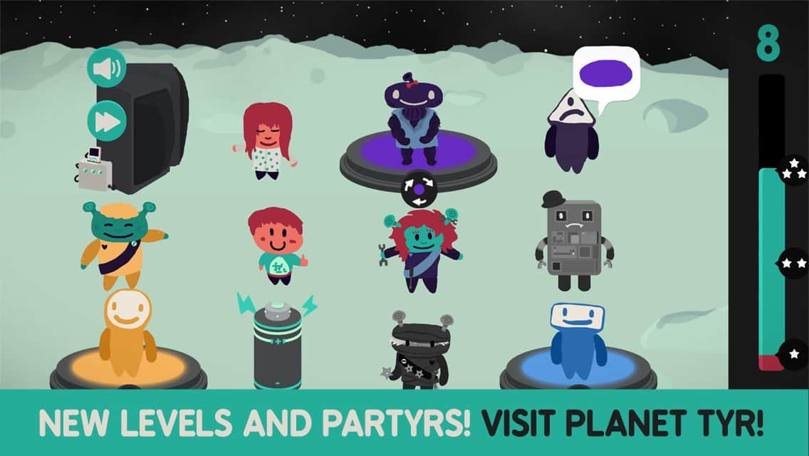 Не смотря на то что Partyrs это всего лишь второй проект студии Shelly Alon без сомнения ребята уже нащупали определенный стиль и направление развития, выбрав нишу простых но увлекательных аркад с элементами логики. Причем стоит заметить что это не сухие логические головоломки, это нечто иное, сочетающее в себе элементы нескольких жанров. И так, 30 забавных существ, в том числе непонятно от куда взявшийся инопланетянин, решают организовать вечеринку, но как известно такое количество персонажей ведет себя на редкость не спокойно и все перепуталось. Ваша задача выстроить героев, используя логику, в нужном порядке, дабы вечеринка пошла по плану. Игровой процесс сочетает простые и понятные правила и довольно сложные уровни, которые потребуют от вас серьезных усилий.