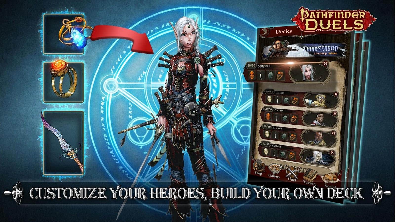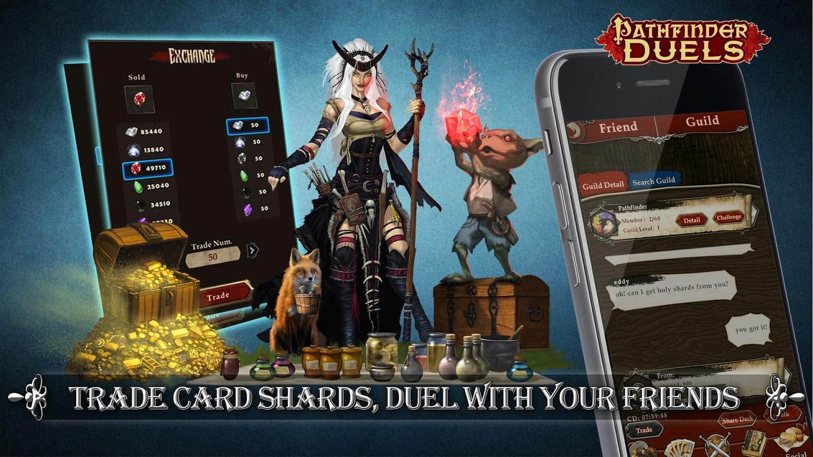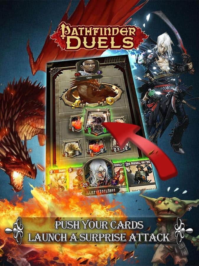 Pathfinder Duels – карточная игра на андроид, где вы будете сражаться с многочисленными врагами. Соберите свою непобедимую коллекцию карт и сражайтесь с врагами на поле боя, показывая все навыки и умения своих героев. Разрабатывайте свою стратегию ведения игры так чтобы обхитрить соперника и загнать его в угол. Соберите в свою колоду легендарных героев и отправляетесь в увлекательное приключение. Получайте ценные материалы через поединки с врагами и обменивайте их на мощные карты. Призывайте могущественных драконов сражаться на вашей стороне, которые будут поглощать врагов огнем ярости.