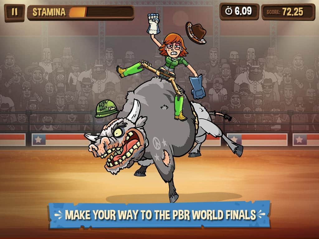 PBR: Raging Bulls - симулятор быка на андроид, где вам предстоит удержаться на нем как можно дольше. Выберете себе героя и садитесь на быка, но держитесь крепко, вас ждут 8 секунд веселья, и огромных прыжков, пока бык будет пытаться вас сбросить со своей спины. Играйте и зарабатывайте очки, благодаря которым вы сможет попасть в Лас-Вегас на финал чемпионата PBR. Начните свою карьеру прямо сейчас и дойдите до финала получив уйму наград.