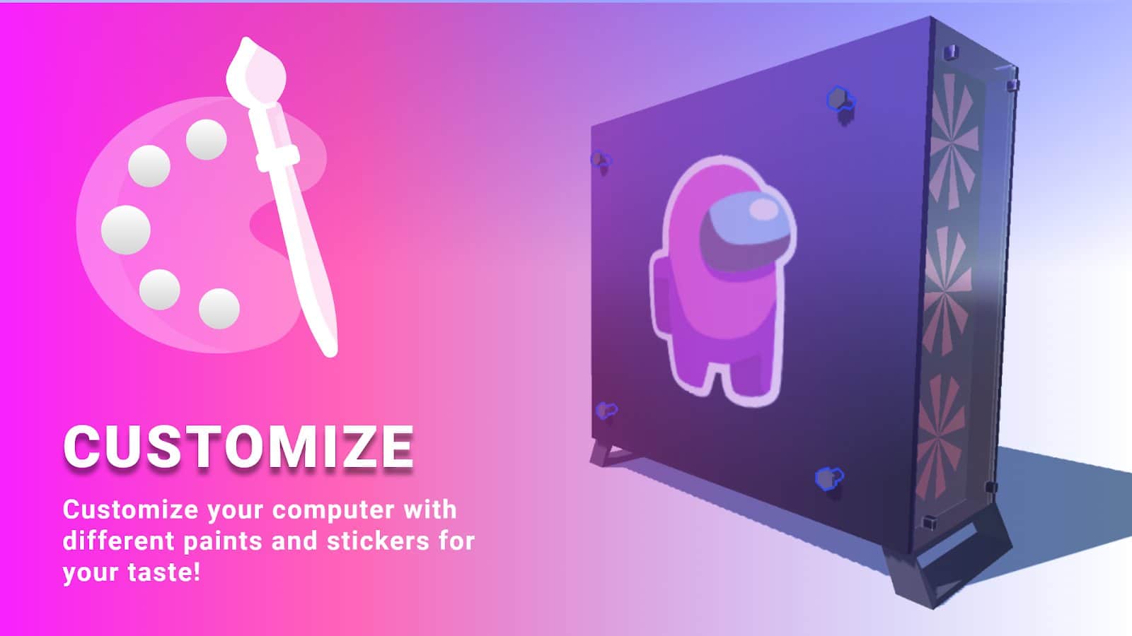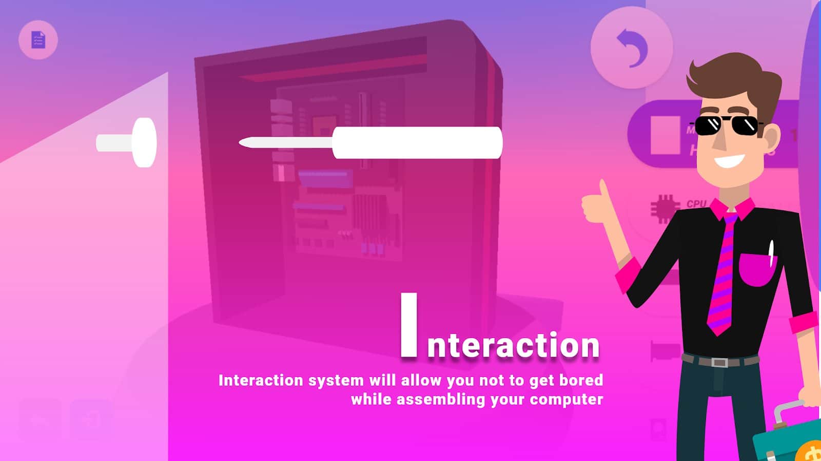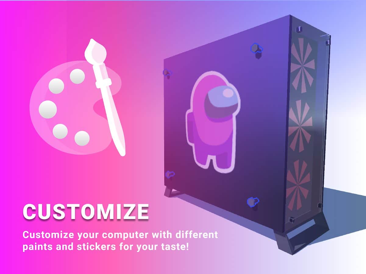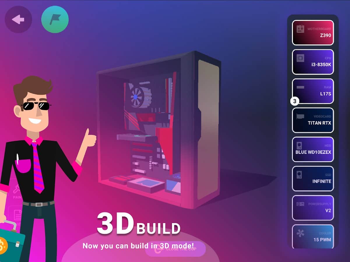 В игре нужно собрать ПК. Нужно покупать детали, корпус, систему и т.д.