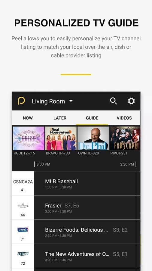 Впрочем, на возможностях пульта функциональность данного приложения не ограничивается. Он может также предложить программу телепередач, порекомендовать интересные каналы, систематизировать трансляции по тематикам (детские, фильмы, спорт, новости и т.д). Причем тем больше вы просматриваете, тем точнее рекомендации Peel Smart Remote.