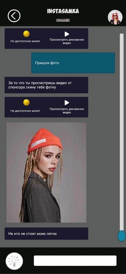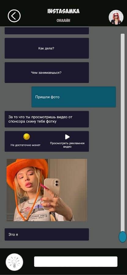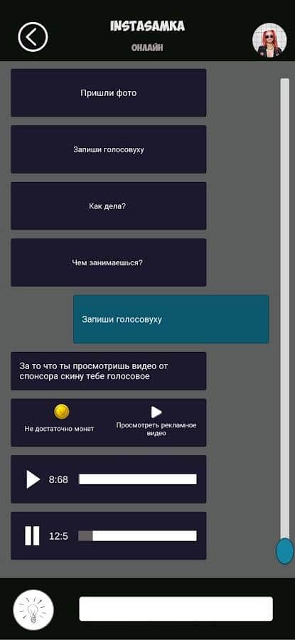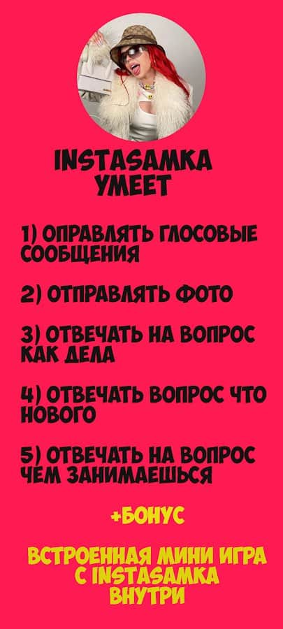 Переписка с Инстасамкой - переписка с популярной дивой Рунета уже на наших экранах. Вы можете написать всё,что хотите (и даже плохие послания) и она ответит вам. Она может отправить вам голосовые сообщения, фотокарточки и отвечать на вопросы такие как "как дела", "что нового" и другие. У неё можно узнать о её новом творчестве. Всё, что вы хотели о ней узнать, она расскажет в этом чате. Также можно поиграть в миниигру, если устали общаться с этой интересной особой.