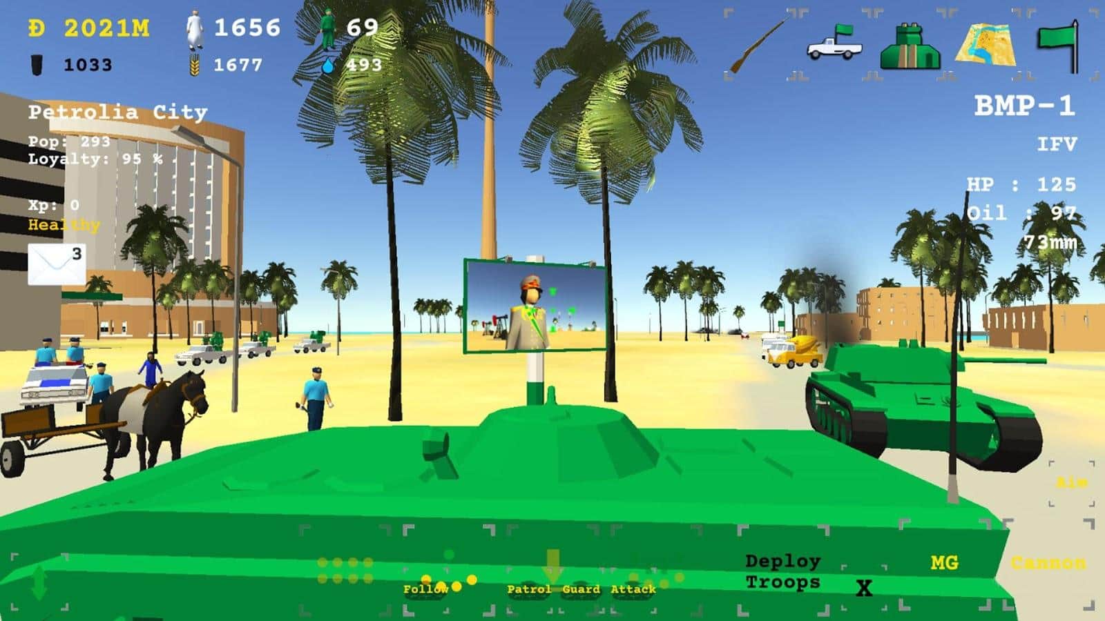 Petrolia – экспериментальная FPS игра на андроид, с огромным открытым миром. В этой игре вы будете управлять небольшой страной и создавать армию чтобы завоевать весь мир. Добывайте нефть, собирайте и вооружайте армию и добивайтесь отличных результатов. Сражайтесь с врагами, сокрушайте сильных повстанцев и покорите весь мир.