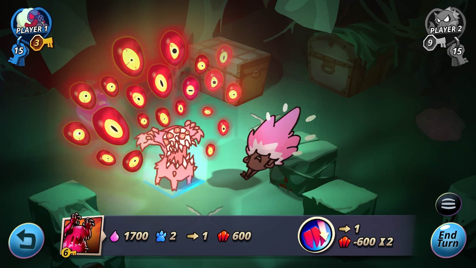 А это даже ещё не начался сам бой... А начинается он с "монетки", которая решает кто начинает первый, а у кого будет +1 ключ. А дальше каждый игрок начинает выпускать монстров из списка всех имеющихся у них, стараясь убить чужое сердце или всех монстров противника. Может, со стороны это и скучно, но вы только представьте сколько тактик можно создать только на одной карте...
