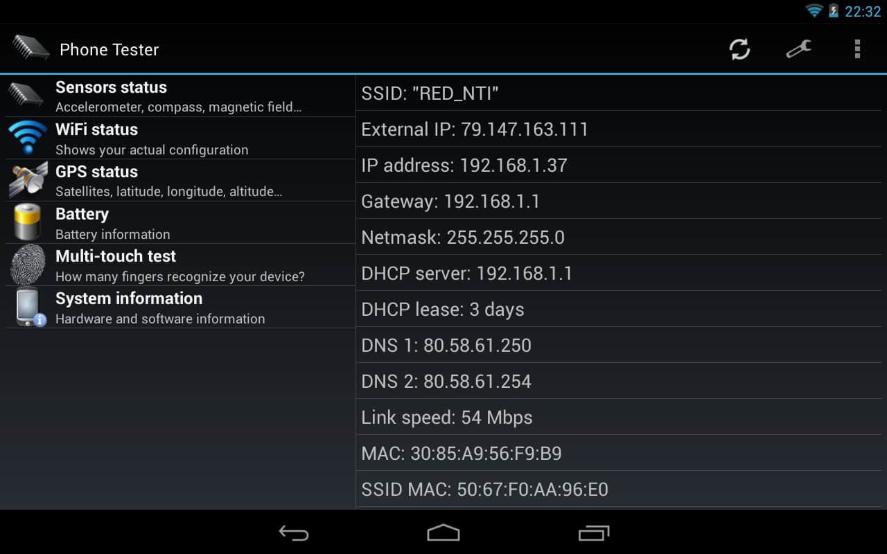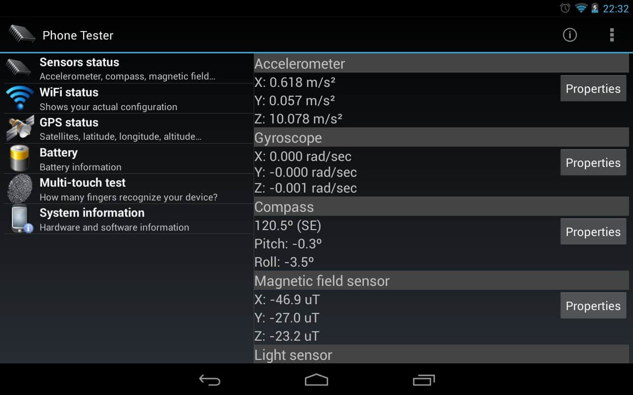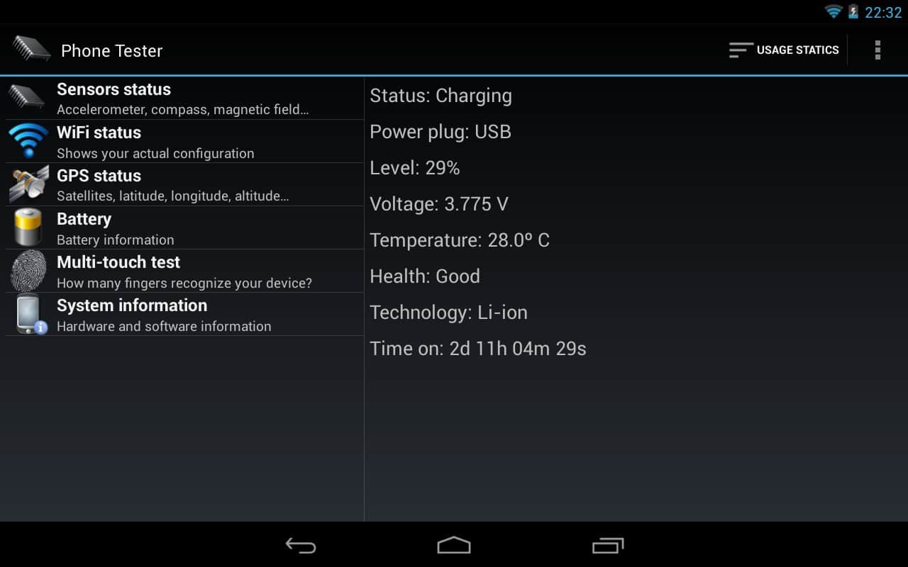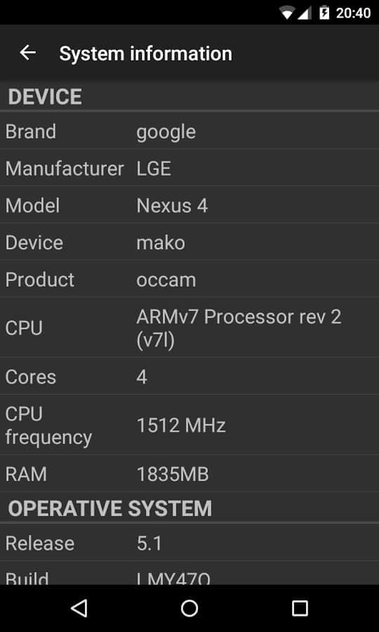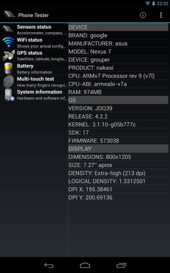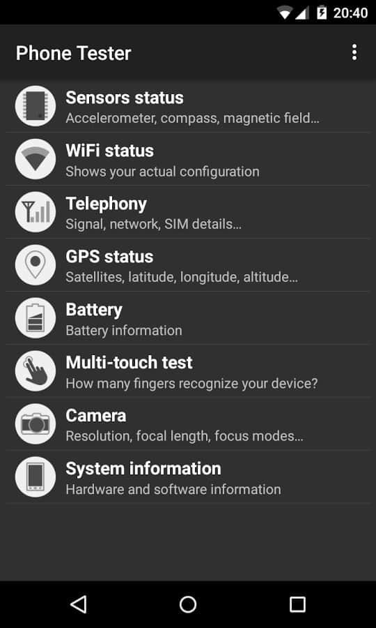 Phone Tester (hardware info) - Великолепное приложение, которое соберет множество различной информации о вашем смартфоне, с его помощью вы сможете узнать все что вам необходимо. Информация об аппаратном и программном обеспечении, как CPU, RAM, ядро, экран и множестве других элементов вашего смартфона.