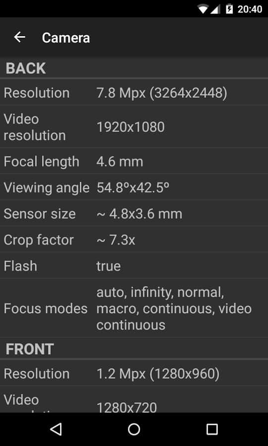 Информация о камере вашего устройства, такие как разрешение, фокусное расстояние, кроп-фактор по отношению к 35-миллиметровой пленке, режимы фокусировки, размер матрицы