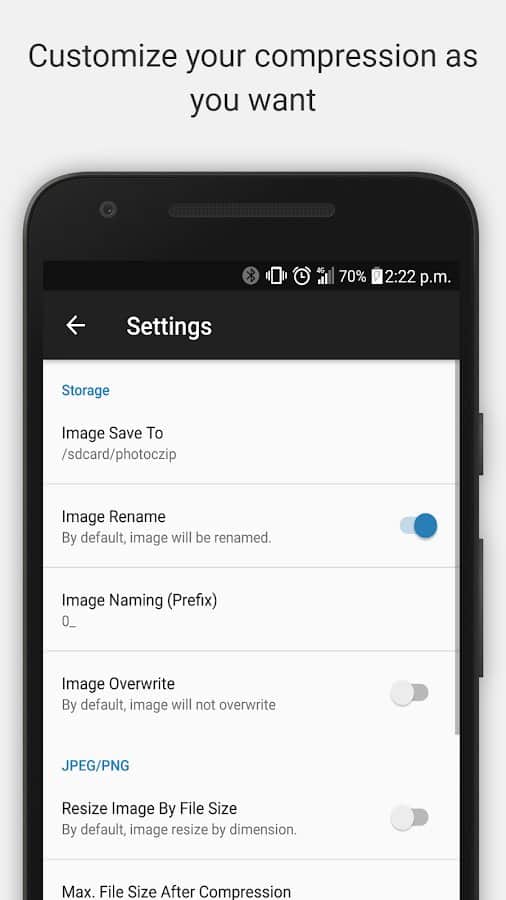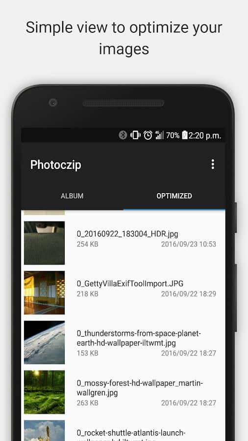 Photoczip пригодится людям, которые часто фотографируют и хранят свои фотографии в памяти телеофн. Приложение позволит вам в считанные секунды сжимать снимки, менять размер и архивировать их. Сделайте свои фотографии максимально легкими по весу, перед тем как будете отправлять их своим знакомым или загружать в социальные сети. Уже сжатые изображения вы можете разглядывать в галерее в режиме предварительного просмотра. Также вы сможете заявлять права на снимки, снабжая каждое изображения водяным знаком и редактировать метаданные JPG-изображений.