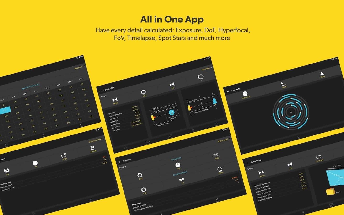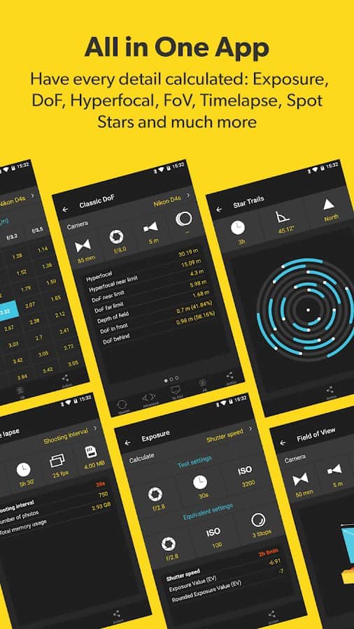 Несколько видов калькуляторов DOF, FOV, Timelapse и др.