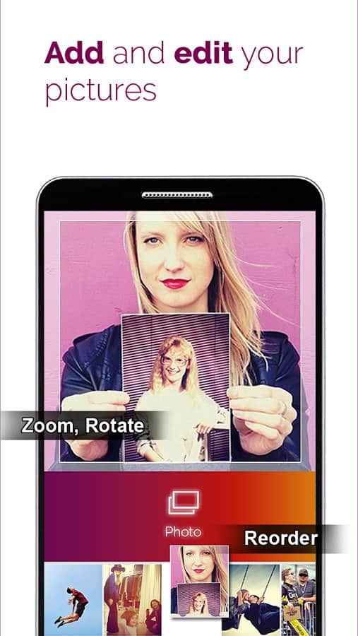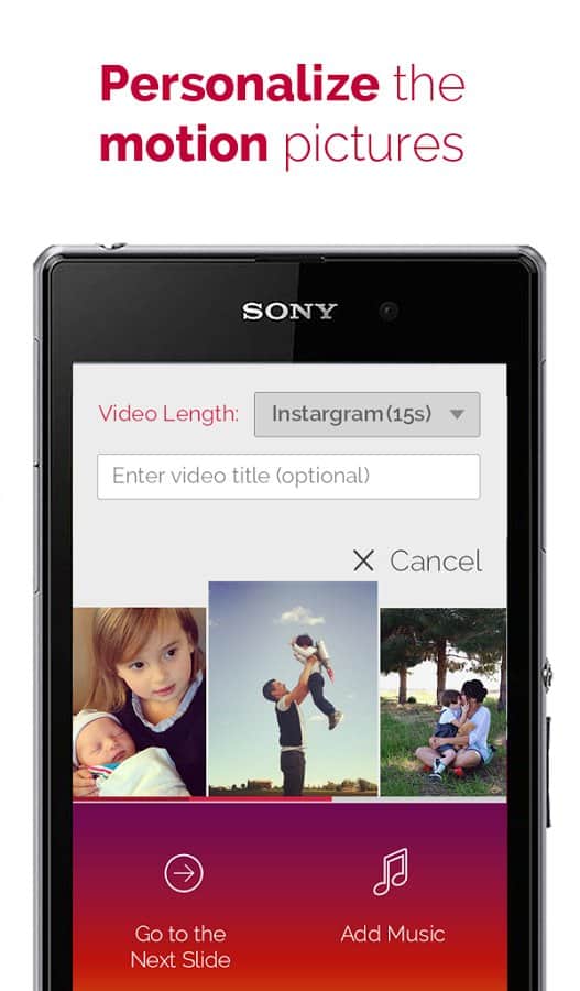 PicMotion - видео слайд-шоу - отличная программа, позволяющая довольно таки просто создавать видео сюжеты с любимыми композициями, фото и даже свои собственным голосом! Иными словами - создание видео слайд-шоу (Instagram, Vine, Youtube). Приложение обладает рядом полезных функций, например, редактирование фото, запись голоса, установка времени начала песни и продолжительности показа каждого изображения и многие другие.