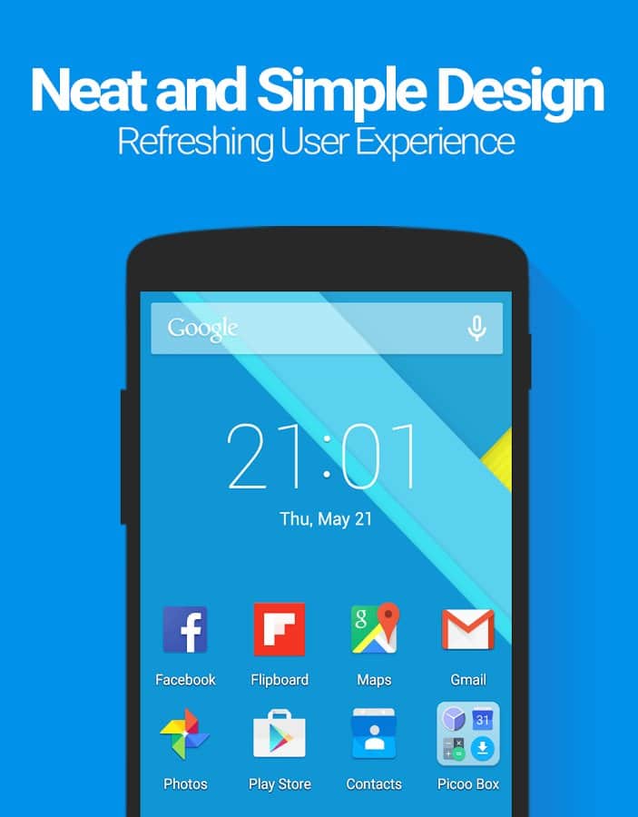 Picoo Launcher—Material Design – великолепный лаунчер с небольшим расходом энергии батареи. Лаунчер занимает мало места в памяти телефона и абсолютно не тормозит операционную систему. В лаунчере организован доступ к наиболее важным приложениям в одно касание. Всё необходимое находится на первом рабочем столе. Также можно создать папку для самых необходимых приложений, которая всегда будет под рукой. Лаунчер выполнен в минималистическом стиле, но от этого он только выигрывает. Всё на своих местах – навигация простая, запутаться невозможно. Лаунчер даёт вам беспрецедентный опыт работы с android 5.0.