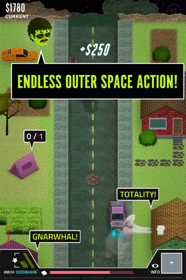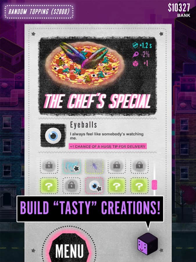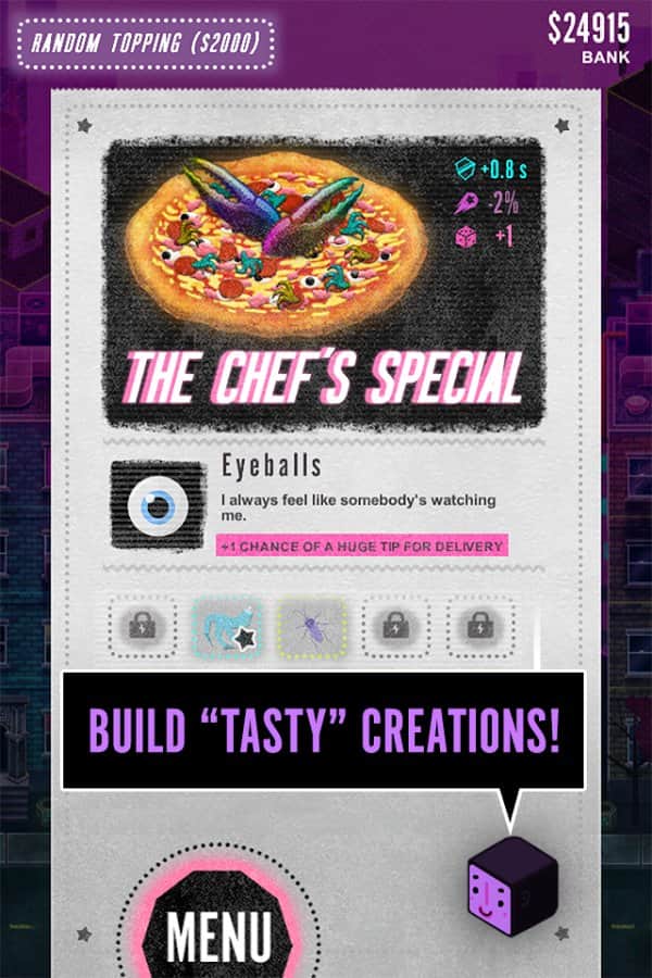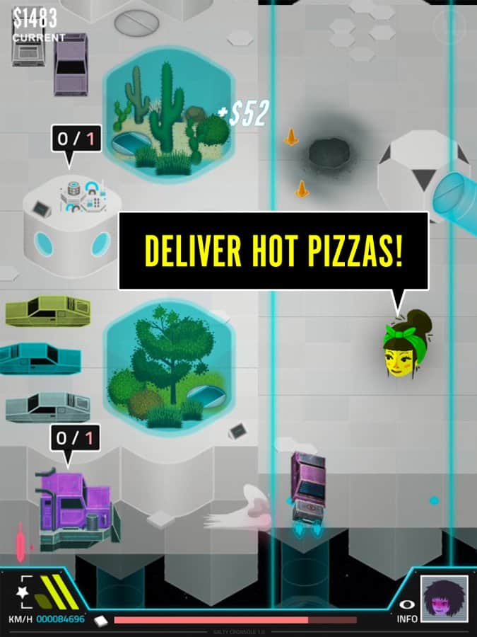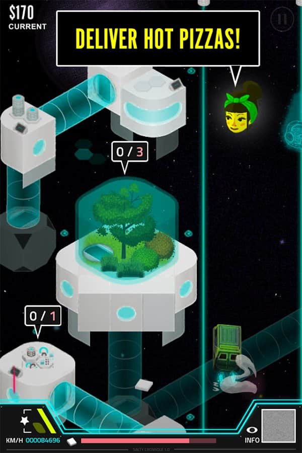 Pie in the Sky – игра о космической доставке пиццы. Межгалактические пиццерии борются за место под солнцем. От курьера зависит скорость доставки и в последствии лояльность клиентов к вашему бренду. Игра выполнена в жанре «Раннер» - управляем межгалактической машинкой и стараемсяпо дороге не попатьс в неприятности. Проявите всё своё умение, ловкость и внимательность, для того чтобы не попасть в аварию не стать виновником дорожное транспортного происшествия. Машину можно совершенствовать и улучшать её показатели. Пицца играет в игре не малую роль – более 75 начинок можно выбрать для неё.