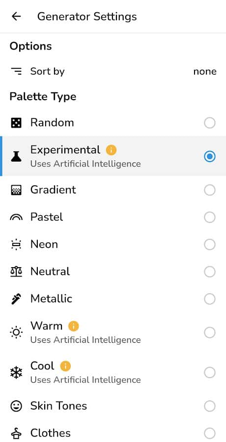 Разнообразные генераторы: выбирайте из множества режимов для создания стартовых цветовых палитр, включая случайные, градиентные, пастельные, нейтральные, металлические, экспериментальные режимы на основе искусственного интеллекта и другие.
