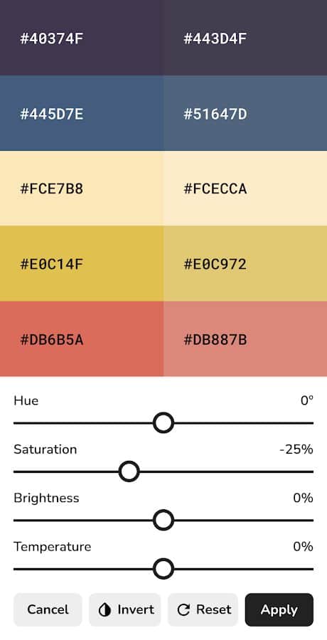 Регулируемая палитра: настройте оттенок, насыщенность, яркость или температуру всей палитры цветов.