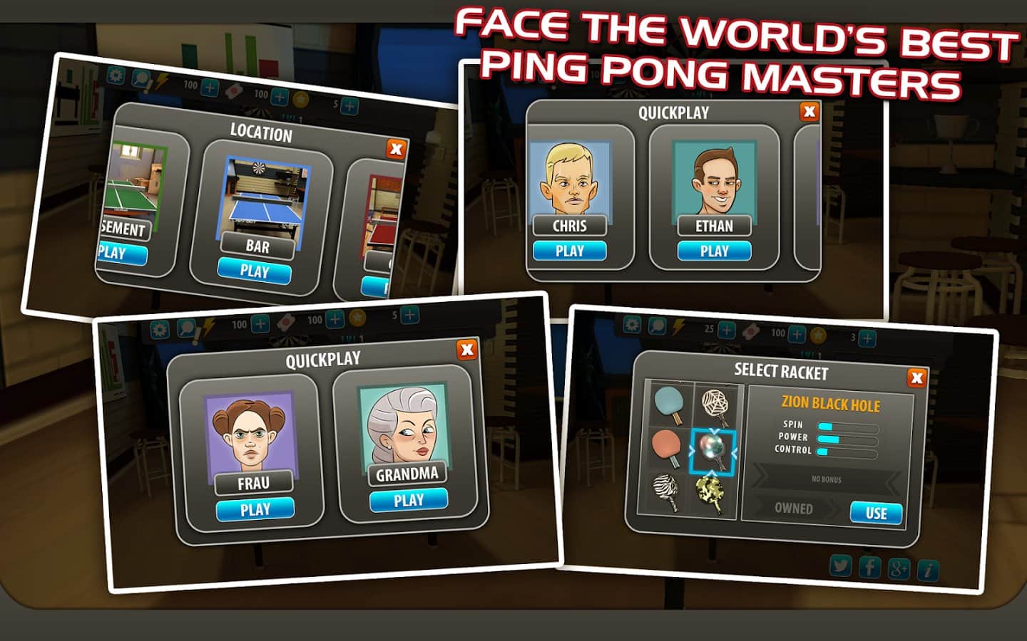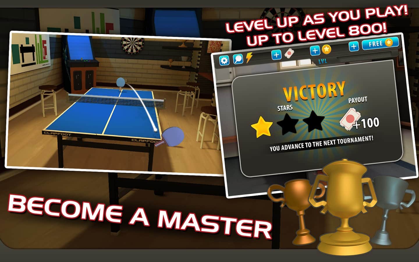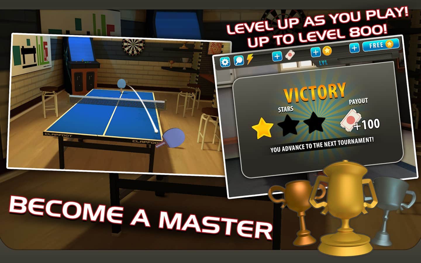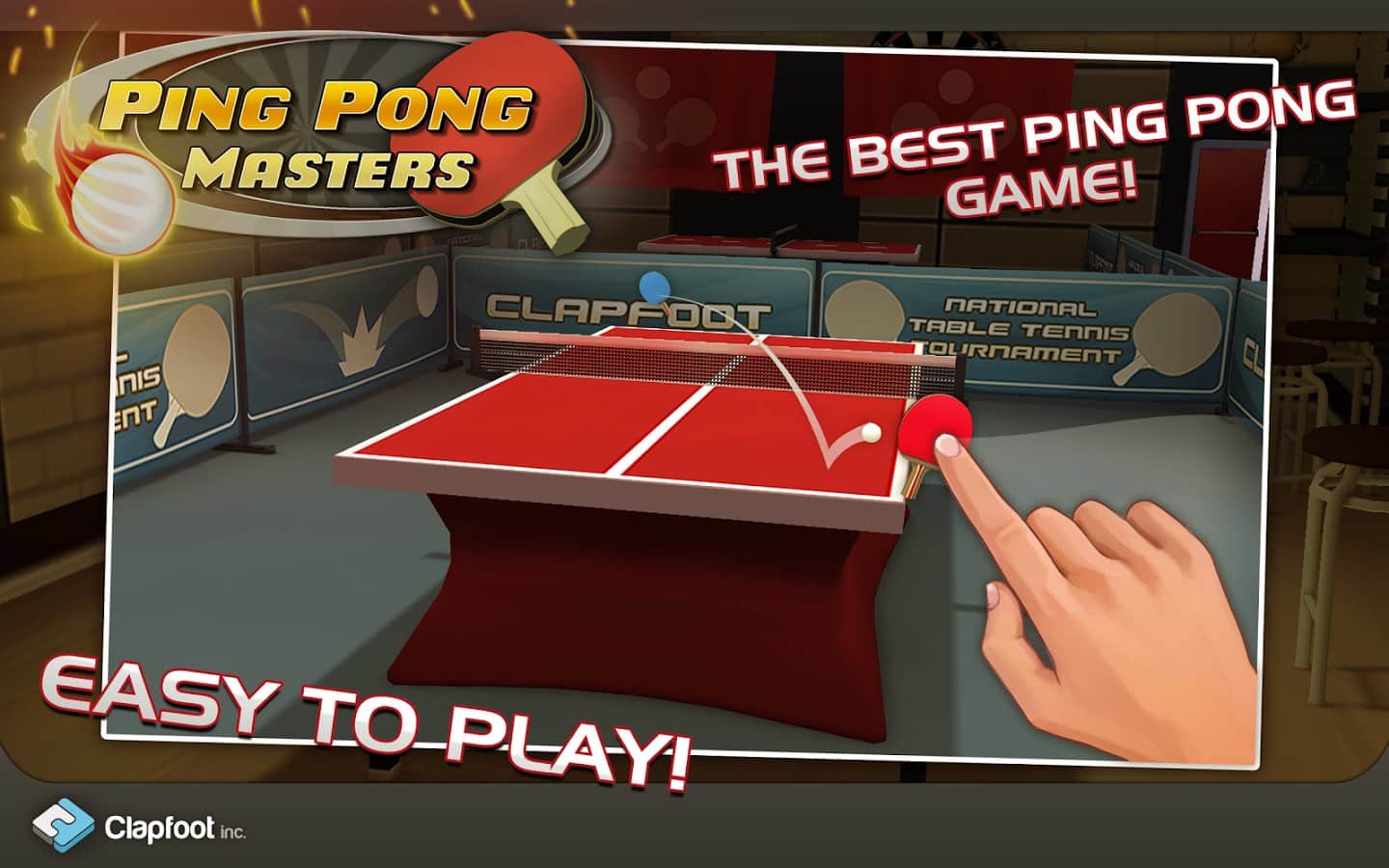 Ping Pong Masters - настольный теннис на ваши мобильные телефоны. Возьмите в руку ракетку прямо сейчас и участвуйте в турнире становитесь его победителем. Бросьте вызов лучшим игрокам пинг-понга и станьте чемпионом мира. Различные турниры, различные оппоненты, быстрая реакция и увлекательное зрелище ждёт всех, кто захочет поиграть в эту игру. В игре большое количество уровней, и разнообразные соперники, так что скучно вам не придется.