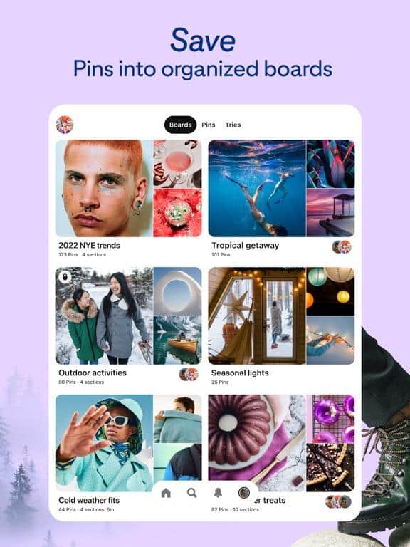 В приложении Pinterest вы сможете не только делиться своими изображениями, но и оценивать пины от других пользователей, а также размещать все картинки в тематические доски.