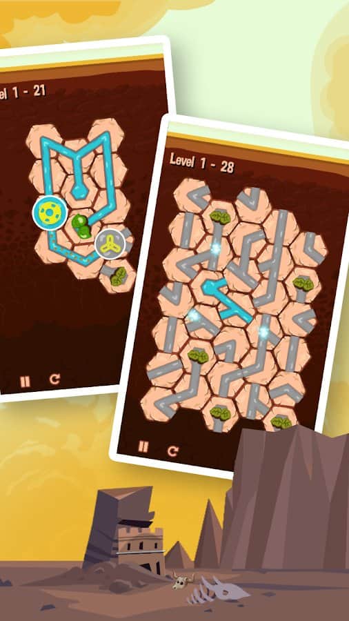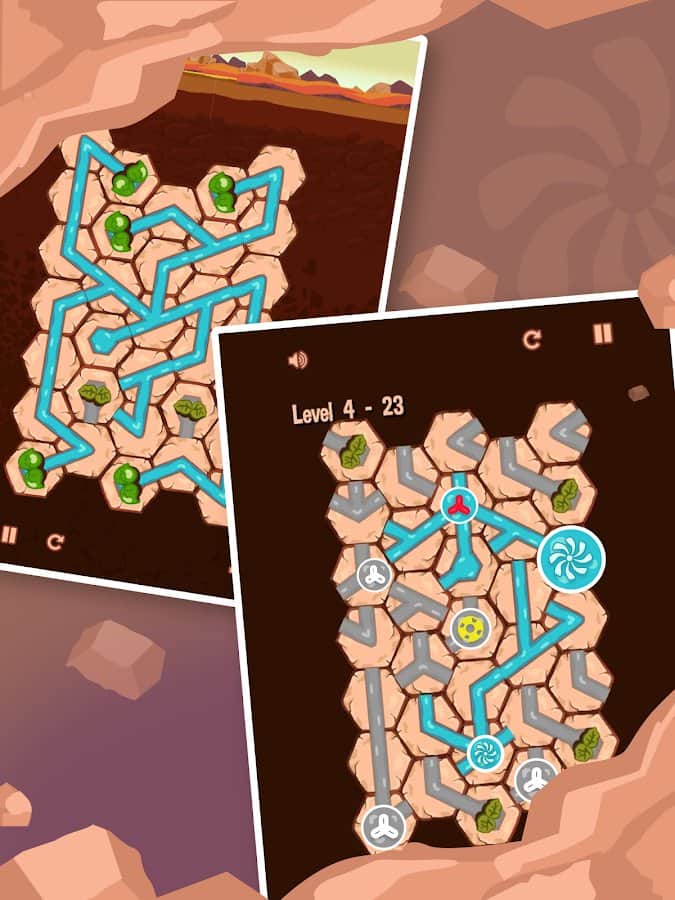 Pipes World - connect the pipes – увлекательная игра головоломка на андроид, где вы будете играть роль водопроводчика. Эта известная всем игра только в новом исполнении. В этой игре вы будете путешествовать по различным островам, и спасать все живое от засухи. Впереди вас ждут более 100 увлекательных уровней, сложность которых будет постепенно расти и добавляется различные объекты. Собирайте трубопровод воедино вращая части трубы для того чтобы соединить его и полить растения. В игре представлено несколько режимов сложности, так что эта игра отлично подойдет для любого возраста. В этой игре вы будете играть с ограничением по времени или по количеству вращений.