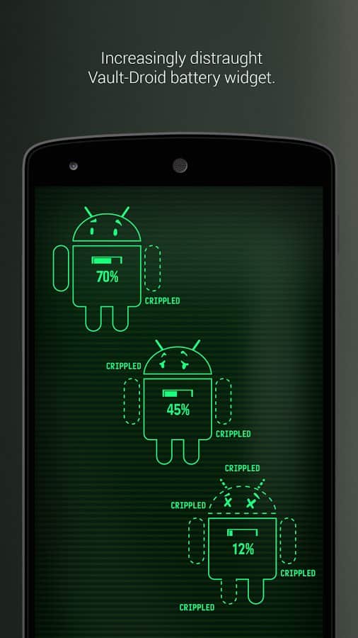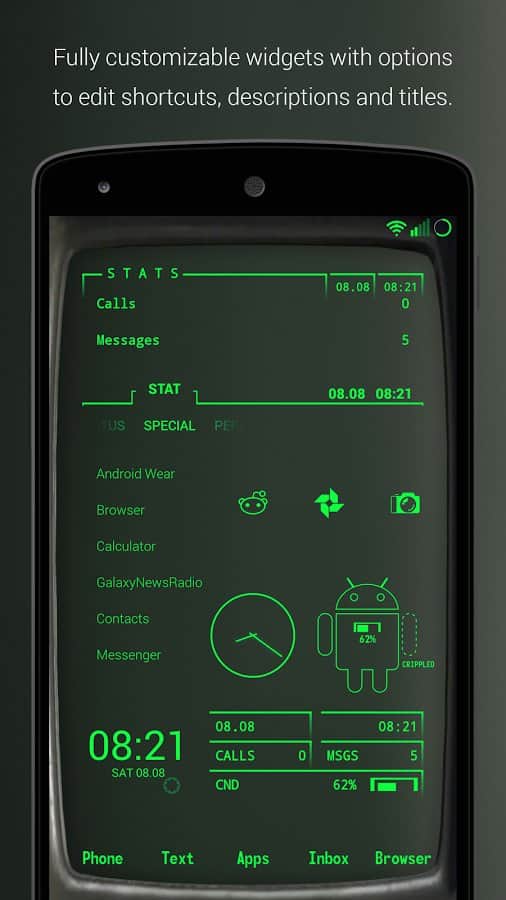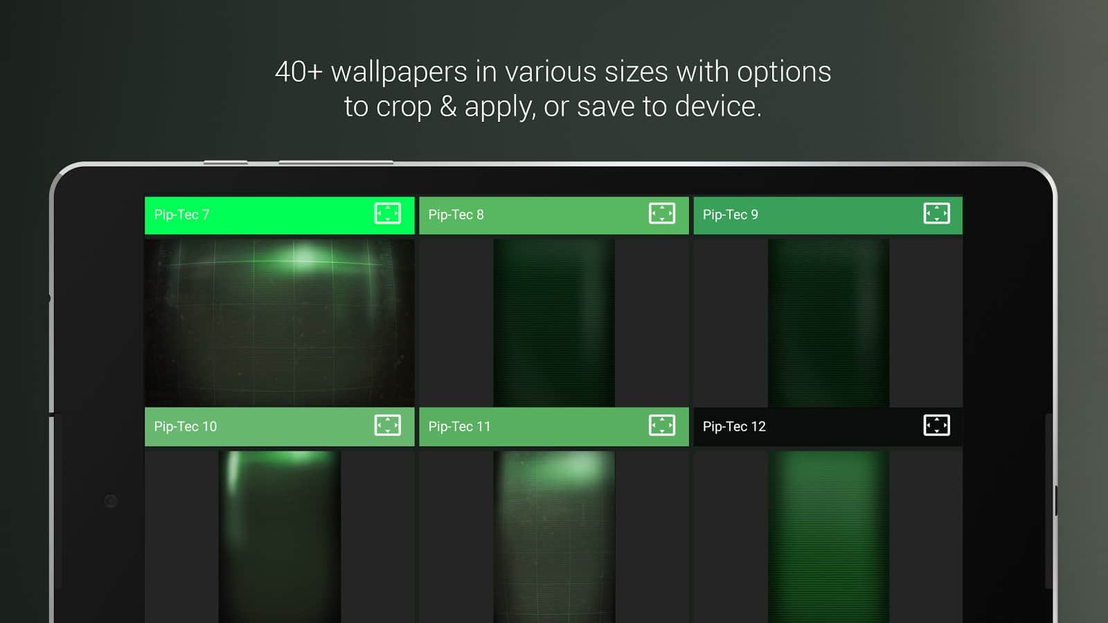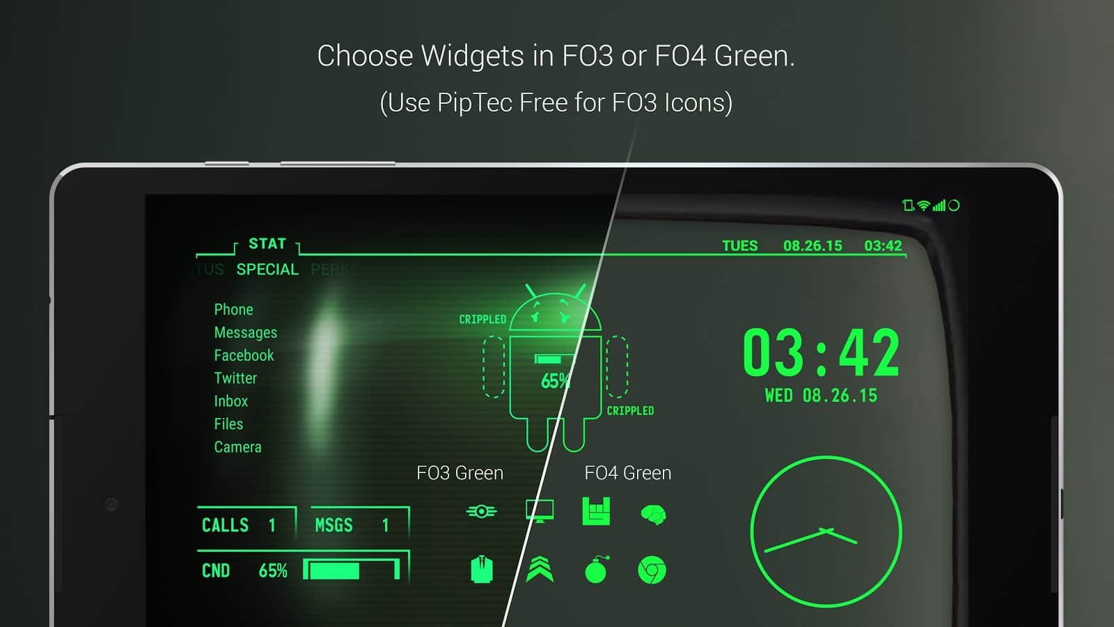 PipTec Green Icons & Live Wall - Данное приложение, сделает из вашего android устройства настоящий pip boy. Оформление сделано в лучших традициях FallOut. Приложение можно легко настроить, и менять можно абсолютно всё. При чем больше не нужно копаться в куче настроек, все иконки, размеры виджетов и многое другое, можно менять просто разводя, или сводя пальцы. Все размеры, настраиваются прямо на экране вашего устройства. Потом вы всё это сохраняете, и вуаля, ваш уникальный pip boy готов к работе. Если вы настоящий ценитель FallOut то данное приложение, поможет вам окунутся в его атмосферу, но уже в реальной жизни.