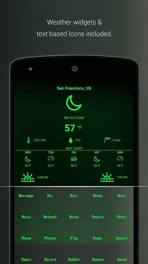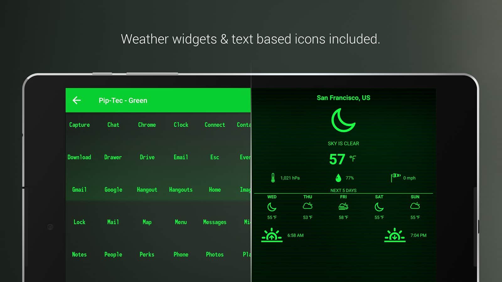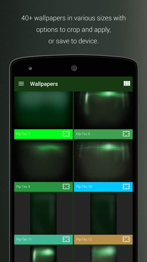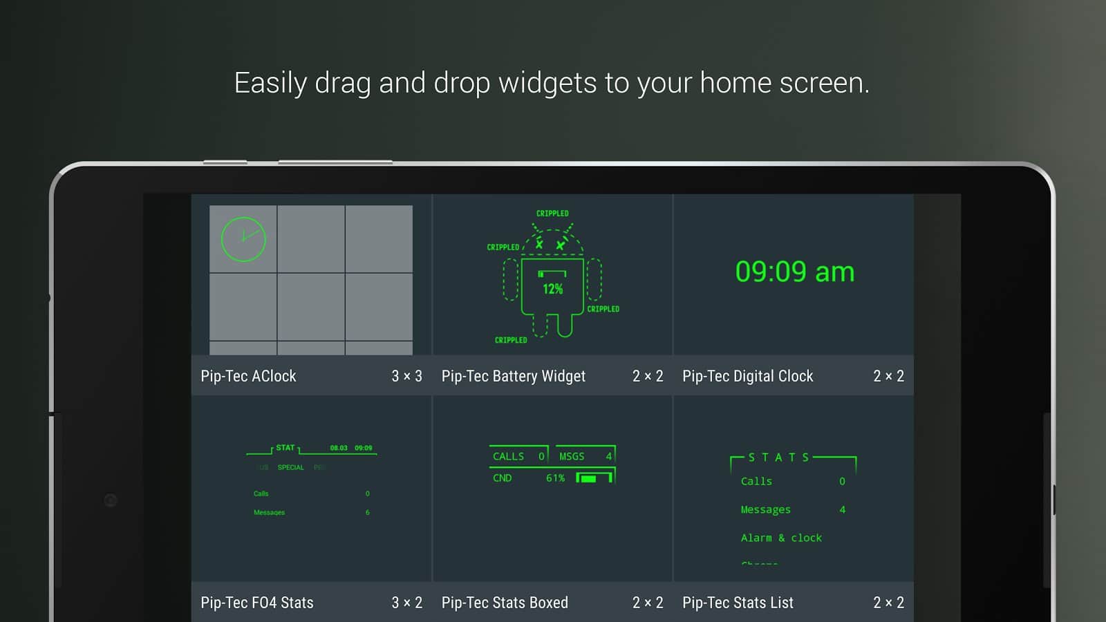 PipTec Green Icons & Live Wall - Данное приложение, сделает из вашего android устройства настоящий pip boy. Оформление сделано в лучших традициях FallOut. Приложение можно легко настроить, и менять можно абсолютно всё. При чем больше не нужно копаться в куче настроек, все иконки, размеры виджетов и многое другое, можно менять просто разводя, или сводя пальцы. Все размеры, настраиваются прямо на экране вашего устройства. Потом вы всё это сохраняете, и вуаля, ваш уникальный pip boy готов к работе. Если вы настоящий ценитель FallOut то данное приложение, поможет вам окунутся в его атмосферу, но уже в реальной жизни.