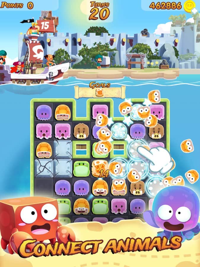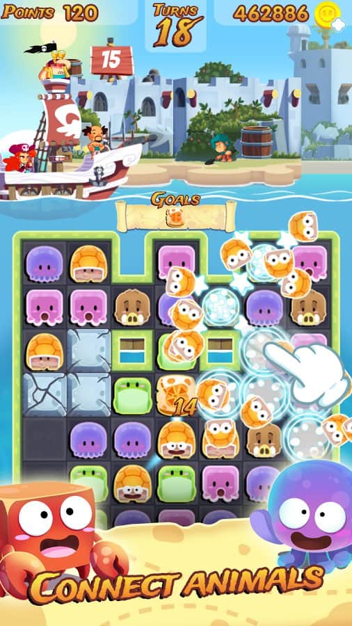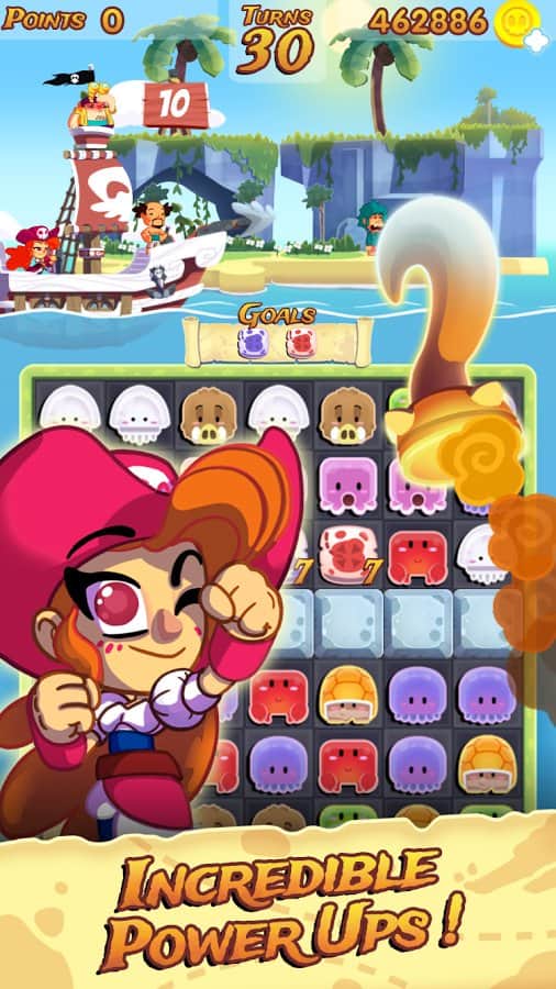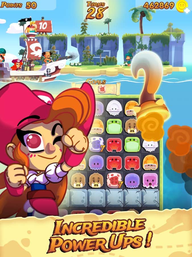 Pirate Match Adventure – игра из жанра три в ряд на андроид, где вы вместе с пиратами отправитесь в незабываемое плаванье. В этой игре наши пираты отправились на поиски несметных сокровищ и только вы способны помочь им заполучить их. Находите на игровом поле одинаковых по виду животных и соединяйте из них ряды. Составляйте как можно более длинные ряды и взрывайте их, тем самым помогая пиратам подобраться ближе к сокровищам. Исследуйте экзотические острова и убирайте с игрового поля морских животных, получая за это очки и фрагменты карты ведущей к сокровищам. В сложных ситуациях применяйте в дело удивительные усиления и бонусы и проходите свой путь как можно быстрее.