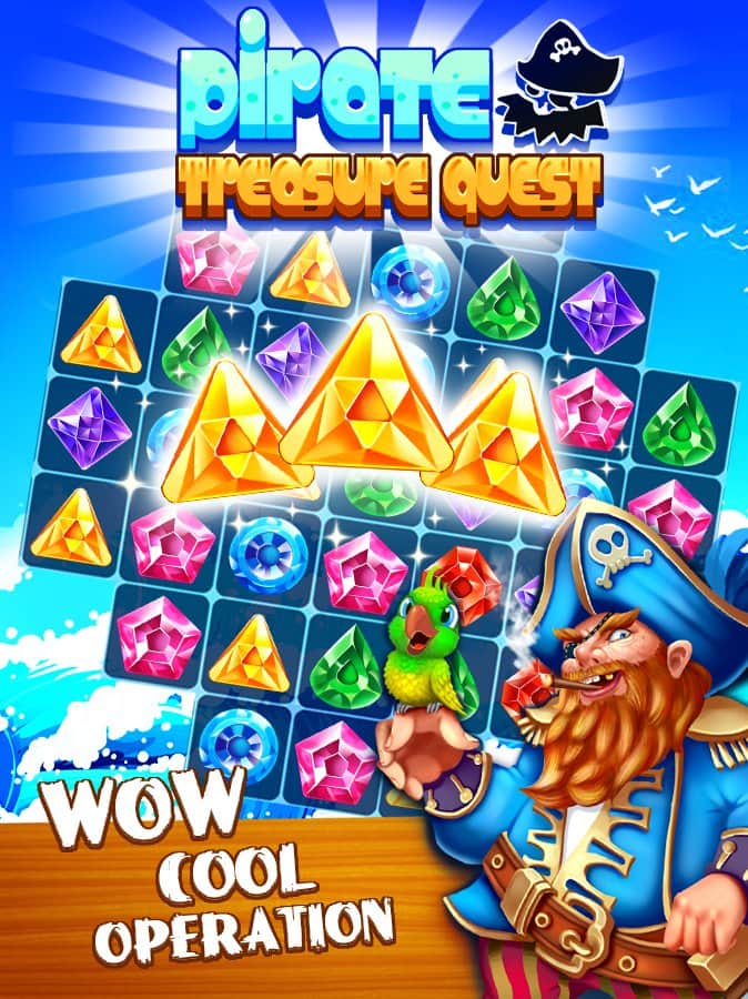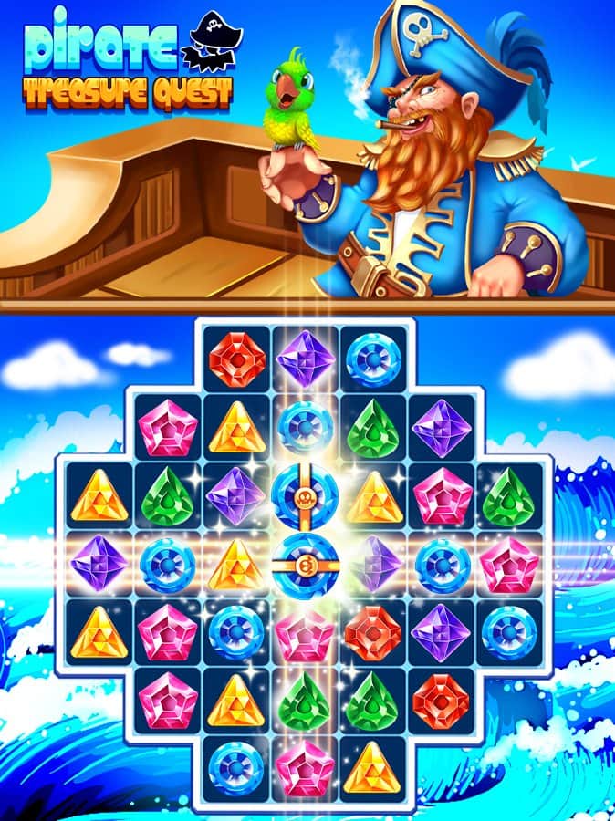 Pirate Treasure Quest – игра из жанра три в ряд на андроид, где вы будете вместе с пиратом искать сокровища. В этой игре вас ждет множество приключений и открытий, где вы будете путешествовать по различным островам и искать пиратские сокровища. Составляйте ряды из разноцветных драгоценных камней и взрывайте их, освобождая место для других. Старайтесь составить как можно длиннее ряды из камней и получить отличные бонусы и усиления. Открывайте для себя новые острова и применяйте для быстрого прохождения уровня древние артефакты. В игре представлено два режима игры, множество различных уровней и усилений.