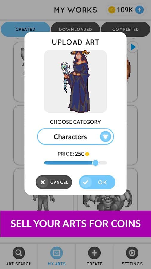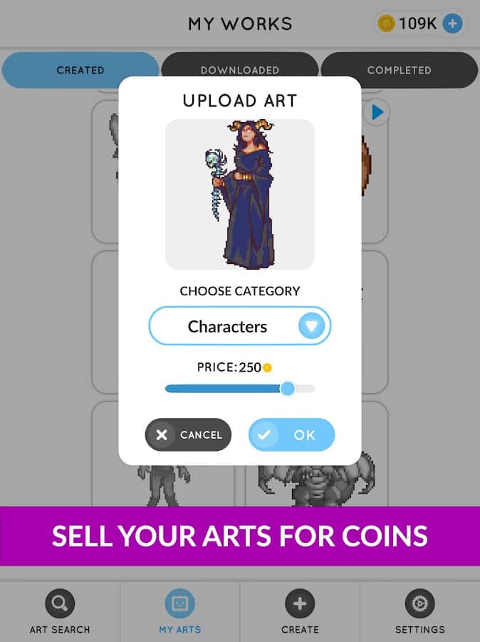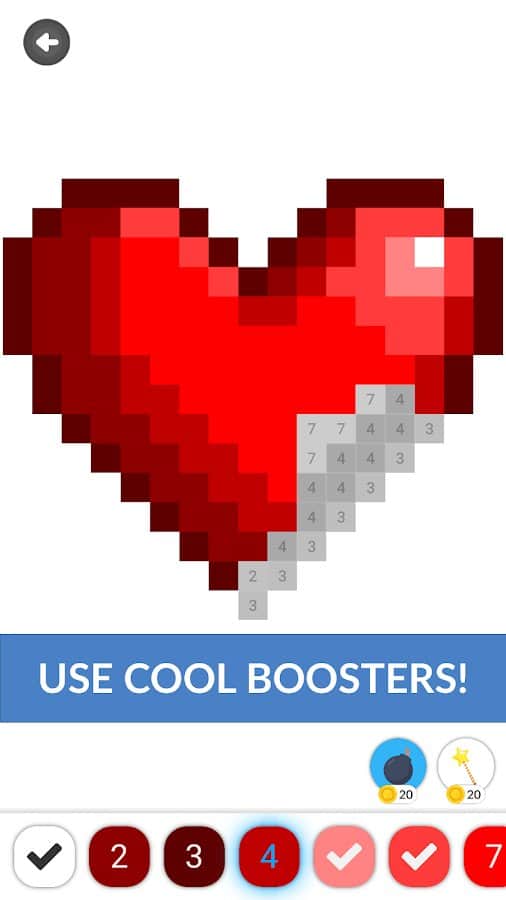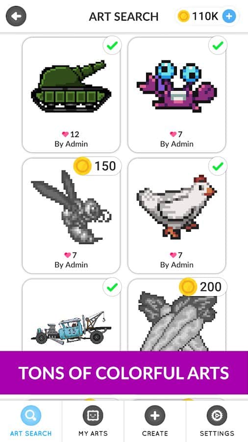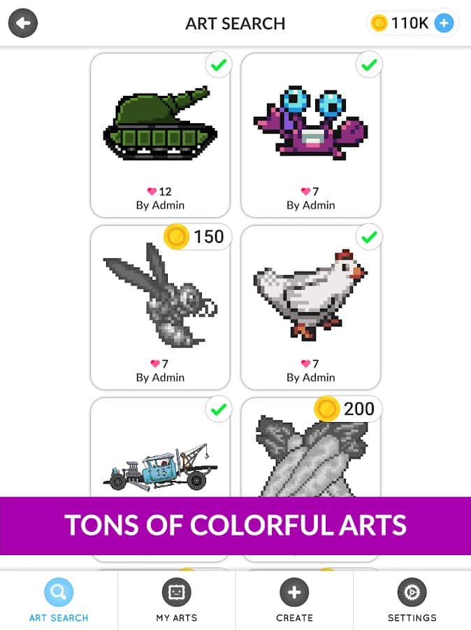 Pixel Art Maker - Раскрашивайте разнообразные картинки по номерам вручную или с использованием специальных бустеров! Выбирайте интересные изображения для начала работы, а также попробуйте загрузить свои фотографии для дальнейшей раскраски. После завершения всех действий, поделитесь своими рисунками с другими людьми и продайте их им за золотые монеты. С помощью этой валюты у вас будет возможность покупать новые бустеры и картинки, что сделает времяпровождения еще интереснее! Регулярно просматривайте свои арты и наслаждайтесь результатами.