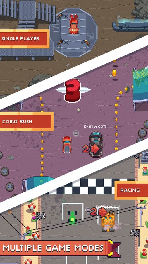 Pixel Drifters: Nitro – увлекательная гоночная игра на андроид, которая подарит вам бесконечное количество адреналина от дрифта. В этой игре вы сядете за руль гоночного автомобиля и будете гонять по различным локациям, уходя от преследования полицейских машин и обходя многочисленные преграды и препятствия на пути. Играйте в одиночном или многопользовательском режиме против друзей или игроков со всего мира. По пути не забывайте собирать многочисленные монетки и машины. Улучшайте свой автомобиль, проделывайте комбо, получайте отличные бонусы, выполняйте многочисленные миссии и уходите от полиции. Разблокируйте для себя все имеющиеся в игре автомобили и прокачайте их.