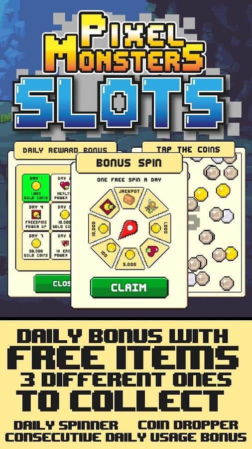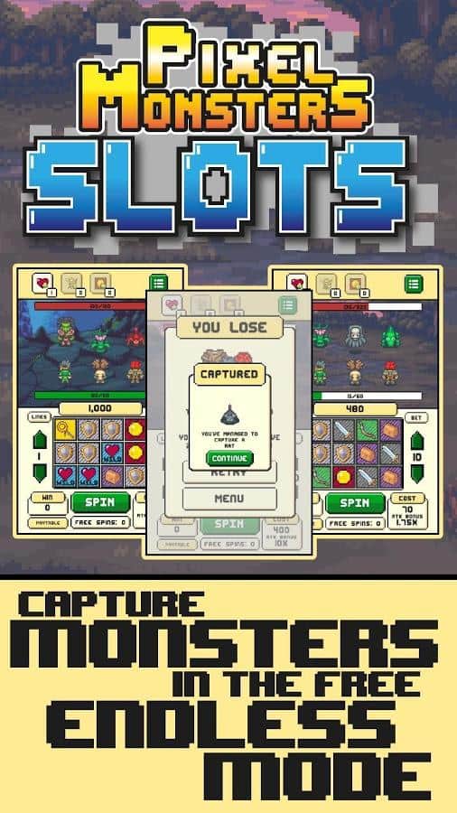 Pixel Monsters: Slots – RPG на андроид, где вы будете помогать команде из трех героев путешествовать по опасному миру этой игры. Ведите своих героев вперед и вступайте в бой с многочисленными врагами и сильными противниками. Атакуйте врагов с помощью выпадения различных предметов или защищайтесь от натиска монстров. В этой игре вы попытаете свою удачу и посмотрите, сможете ли вы победить всех врагов путем выпадения тех или иных слотов с атаками или защитой. Побеждайте вставших на вашем пути врагов и собирайте ценную добычу после победы, а также пополняйте свою коллекцию героев новыми персонажами. Получайте многочисленные усиления и побеждайте быстрее своих врагов.